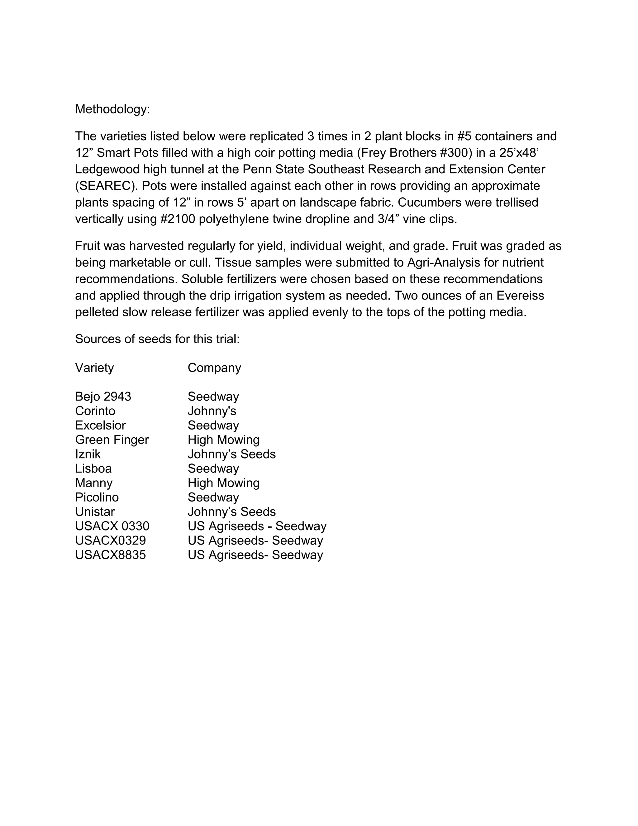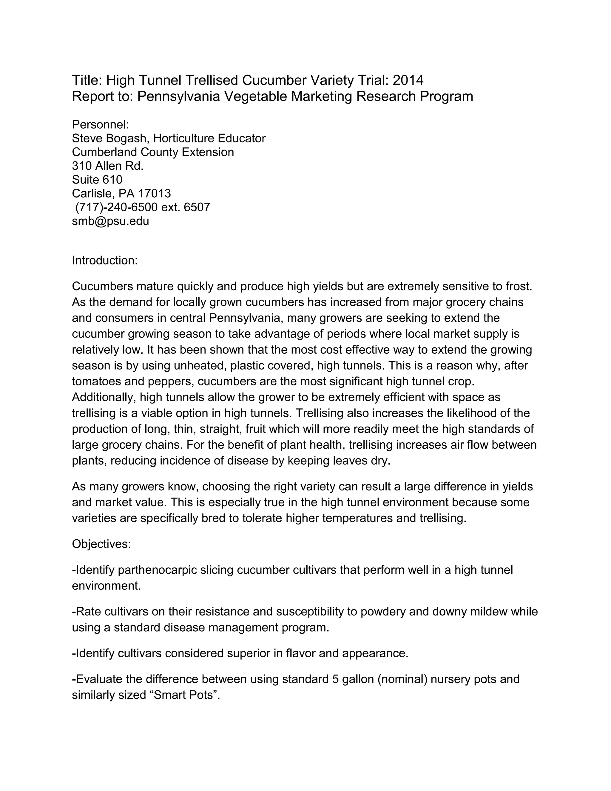 The report evaluates various cucumber cultivars grown in high tunnels, focusing on their performance, disease resistance, and marketability. It identifies several superior varieties, including 'Corinto' and 'USACX 0329', while noting challenges such as high cull rates for some types. The study concludes that using smart pots can enhance yields and reduce cull rates, highlighting the importance of variety selection for optimal production outcomes.