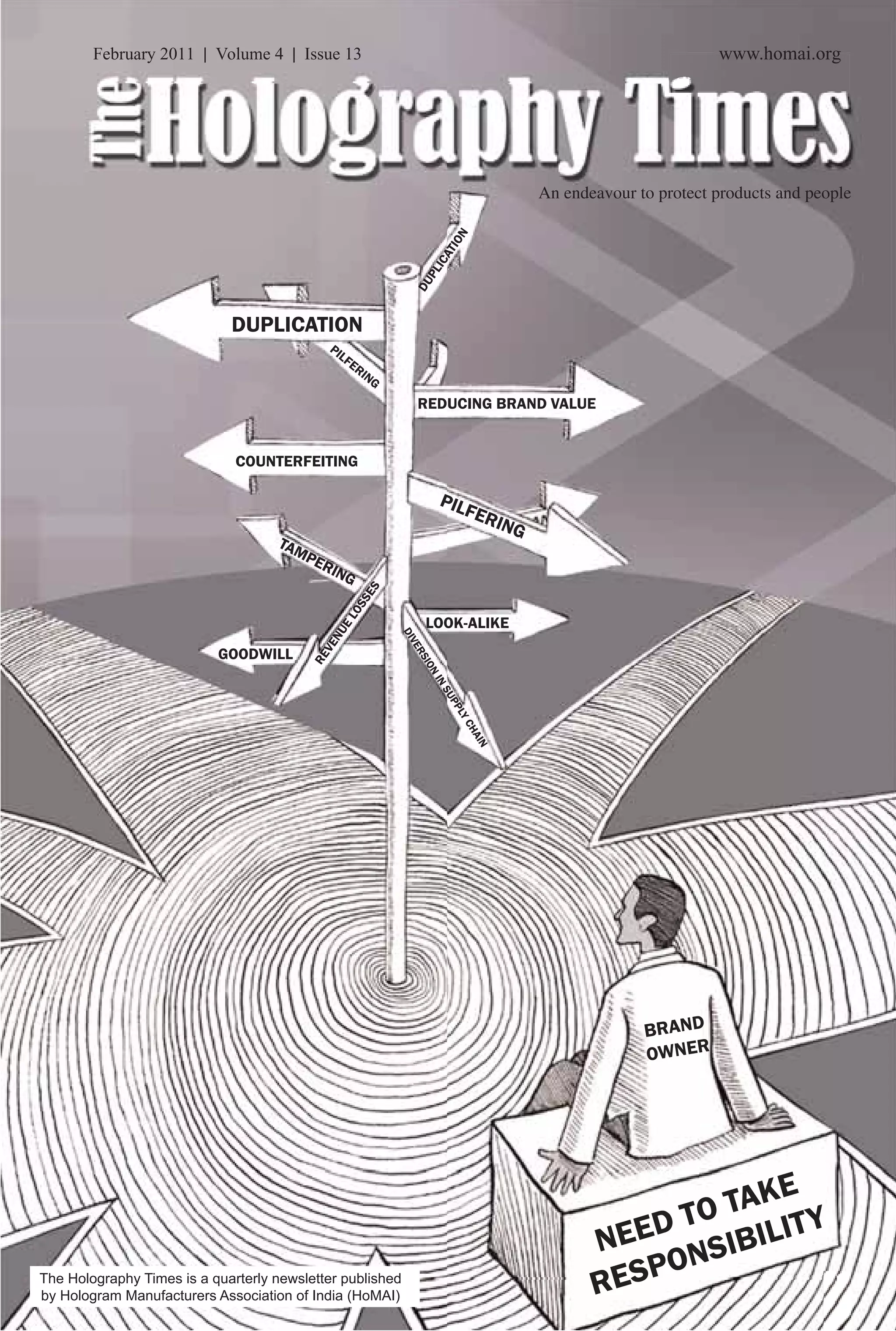 This document is the February 2011 issue of The Holography Times, a quarterly newsletter published by the Hologram Manufacturers Association of India. The issue includes news about new holographic security features being used on IDs and liquor stamps to prevent counterfeiting. It also discusses the growing security printing market in Central and Eastern Europe. The main article examines challenges and solutions for brand protection against counterfeiting.