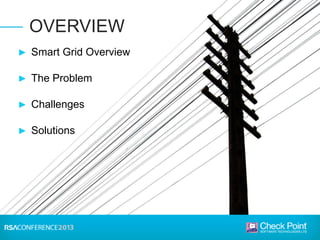 This document discusses the security challenges facing the smart grid. It notes that the smart grid involves networking power infrastructure like substations, distribution networks, and smart meters. However, energy companies building these systems lack security expertise. Attacks on power infrastructure could have serious consequences by disrupting power or killing people. The document outlines challenges like default passwords on equipment and USB attacks. It argues that a "hard exterior/soft interior" security model is not enough, and recommends measures like malware detection, control protocol inspection, and frequent software updates to help secure the smart grid.