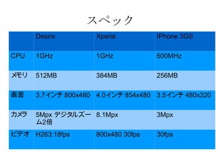 スペック Desire XperiaIPhone 3GS CPU 1GHz 1GHz 600MHz メモリ 512MB 384MB 256MB 画面 3.7 インチ 800x480 4.0 インチ 854x480 3.5 インチ 480x320 カメラ 5Mpx デジタルズーム 2 倍 8.1Mpx 3Mpx ビデオ H263:18fps 800x480 30fps 30fps - 3.