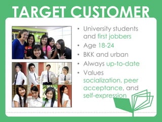 This marketing plan aims to increase website traffic and brand awareness among target customers aged 18-24 in Bangkok. It proposes 5 campaigns: 1) a celebrity touch campaign to create buzz, 2) a campaign allowing customers to customize their phone's features, 3) a product showcase at Siam Paragon mall, 4) educational events on the 5 senses, and 5) a puppetry campaign partnering with movie theaters to demonstrate the phone's features. The goals are to increase interactions, perceptions of HTC as fun, and long-term sales.
