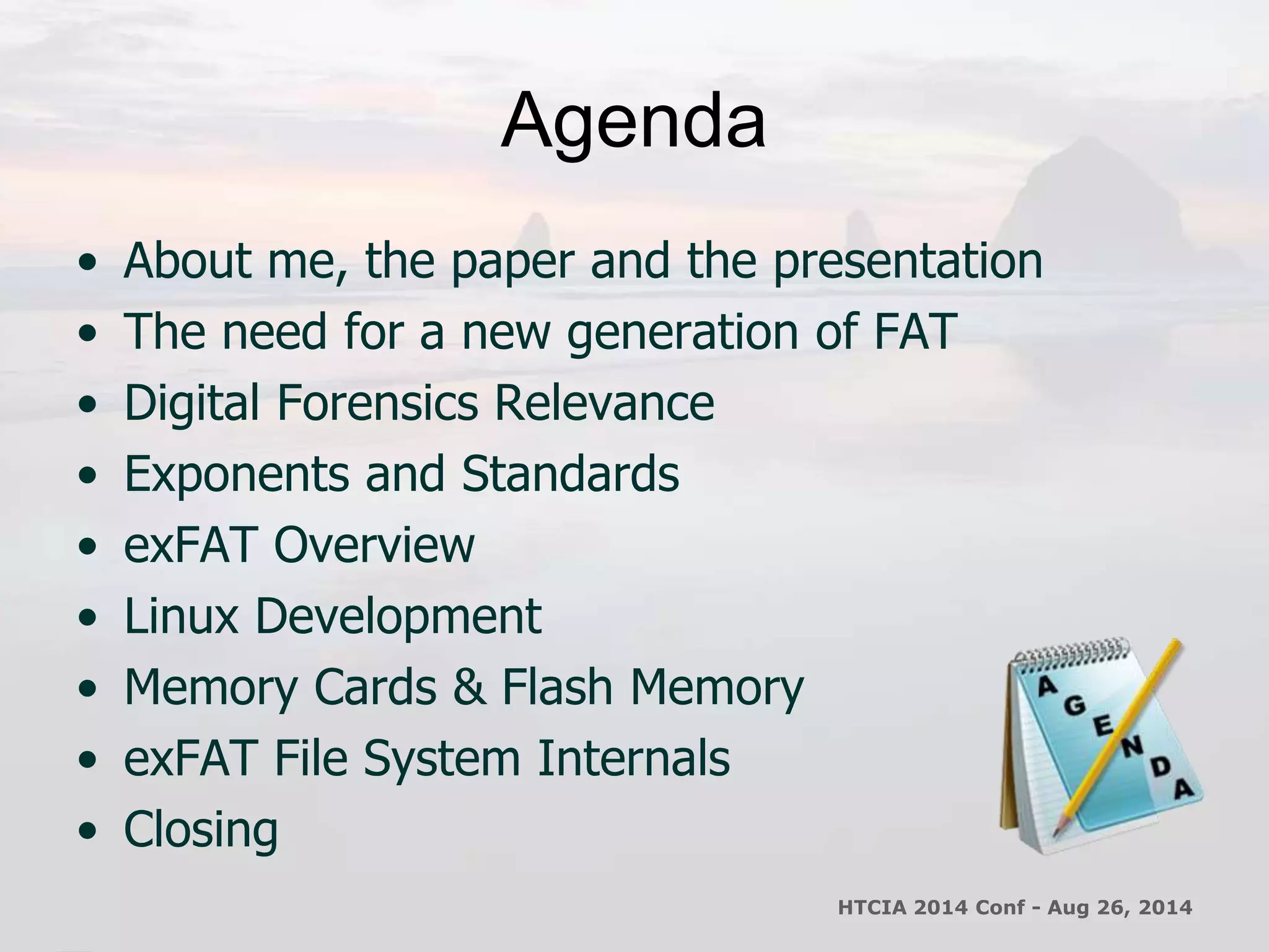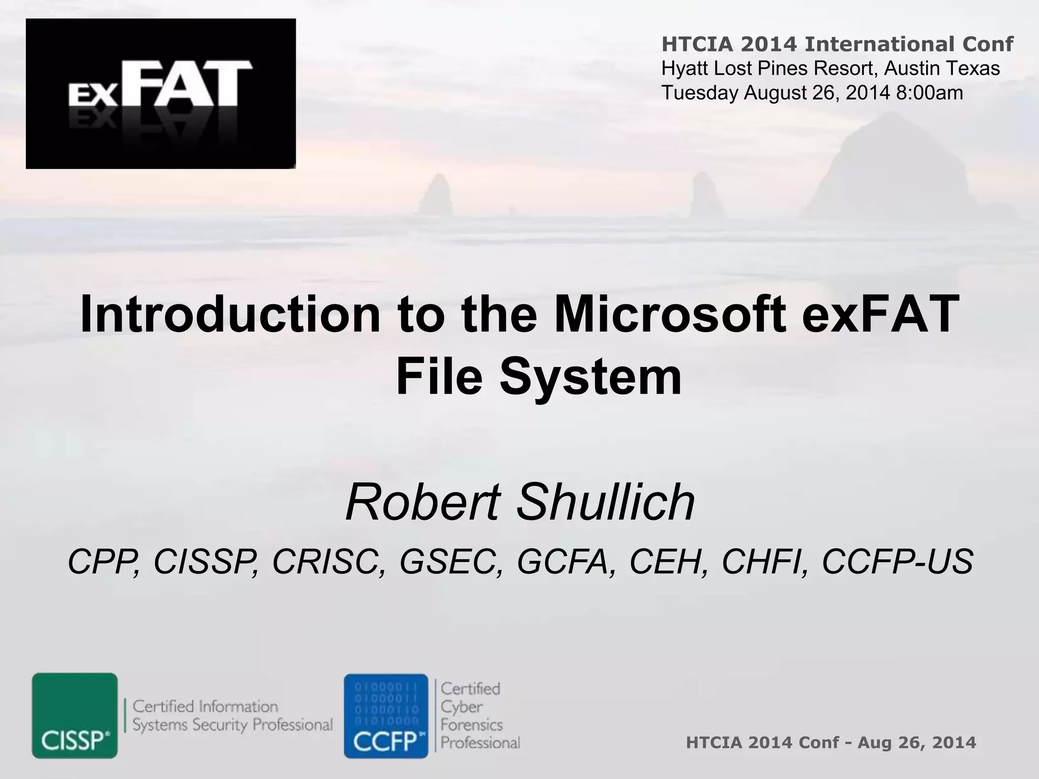 The document presents an introduction to the Microsoft exFAT file system at the HTCIA 2014 conference, outlining its relevance to digital forensics, historical context, and technical specifications. It discusses the limitations of legacy FAT systems, the need for a new file system that supports larger volumes and files, and the advantages of exFAT, particularly for modern applications. The presentation emphasizes the significance of understanding exFAT for forensic investigations and highlights existing challenges in the current digital forensics landscape.