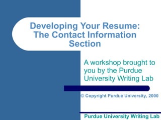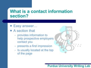The document provides guidance on developing an effective contact information section for a resume. It recommends including your name, addresses, phone numbers, email, and website. The section also discusses design strategies like font selection, text formatting, layout, and adding a graphic element. Finally, it stresses proofreading thoroughly to ensure accuracy and presenting all application materials with a consistent, professional design.