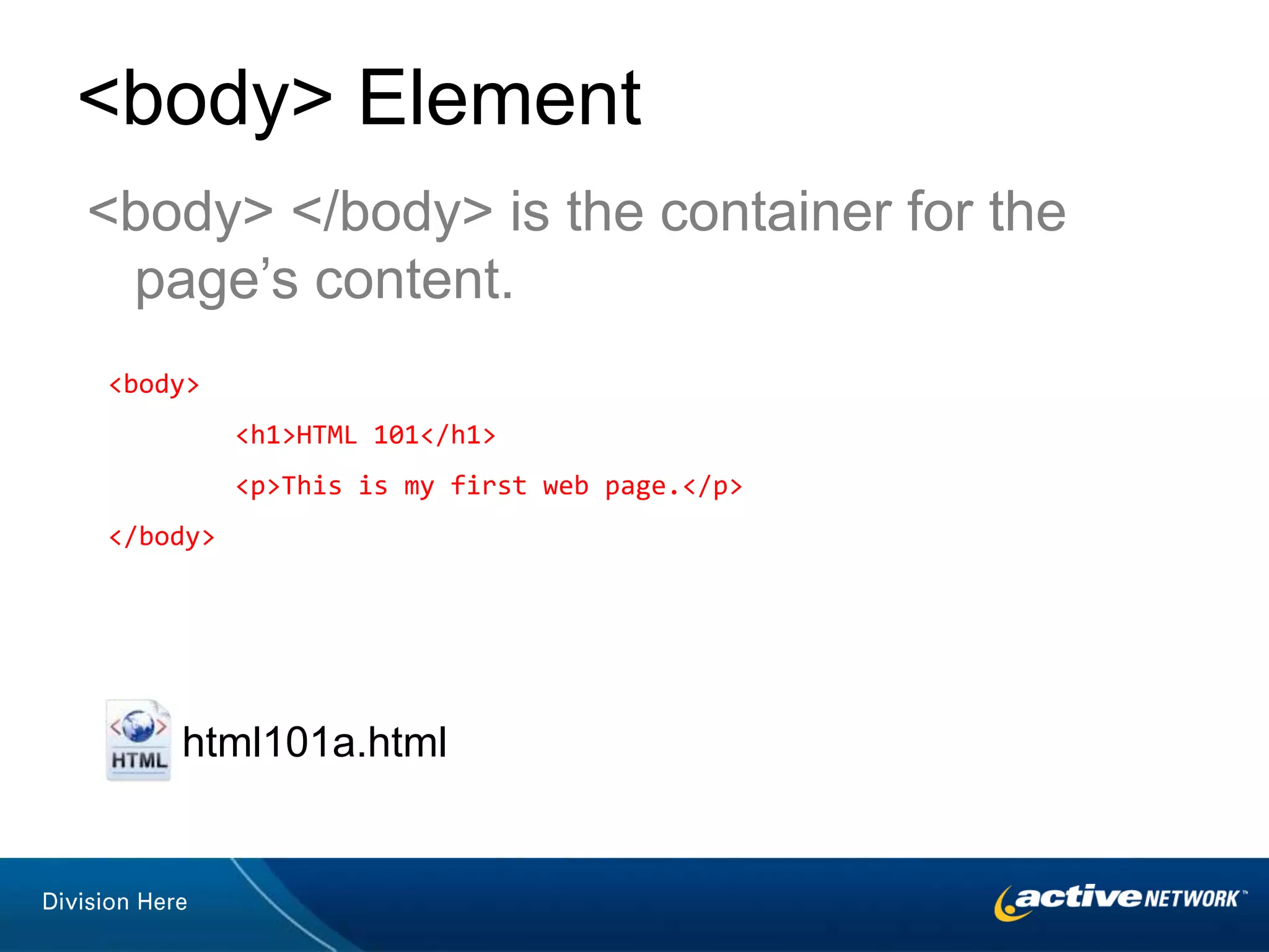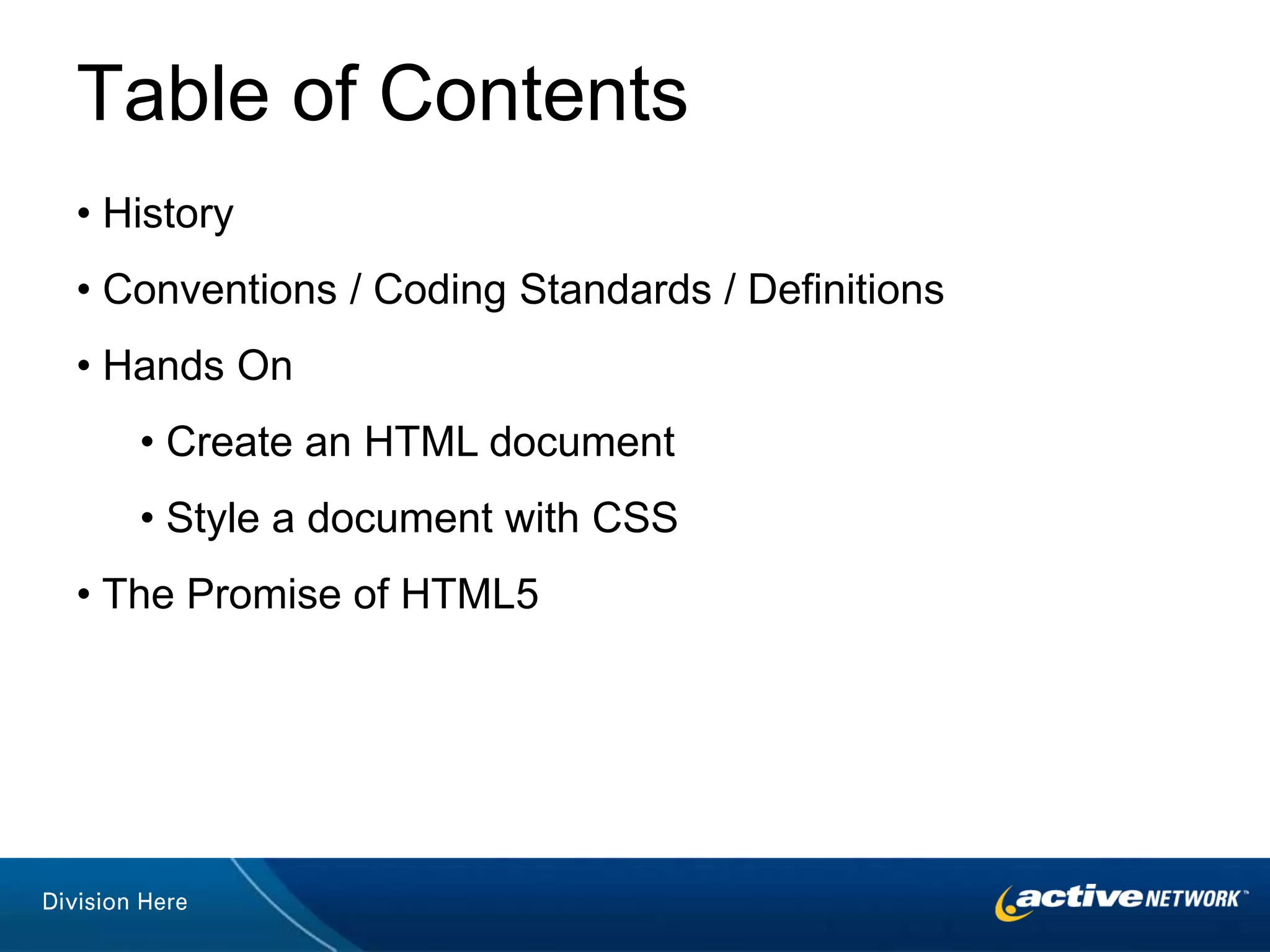 The document serves as a comprehensive guide on HTML fundamentals, including coding standards, structure, and essential HTML elements. It discusses the importance of separating structure from presentation using HTML and CSS, along with practical examples for creating and styling web pages. Additionally, it highlights the advancements of HTML5, such as semantic containers and native multimedia elements.