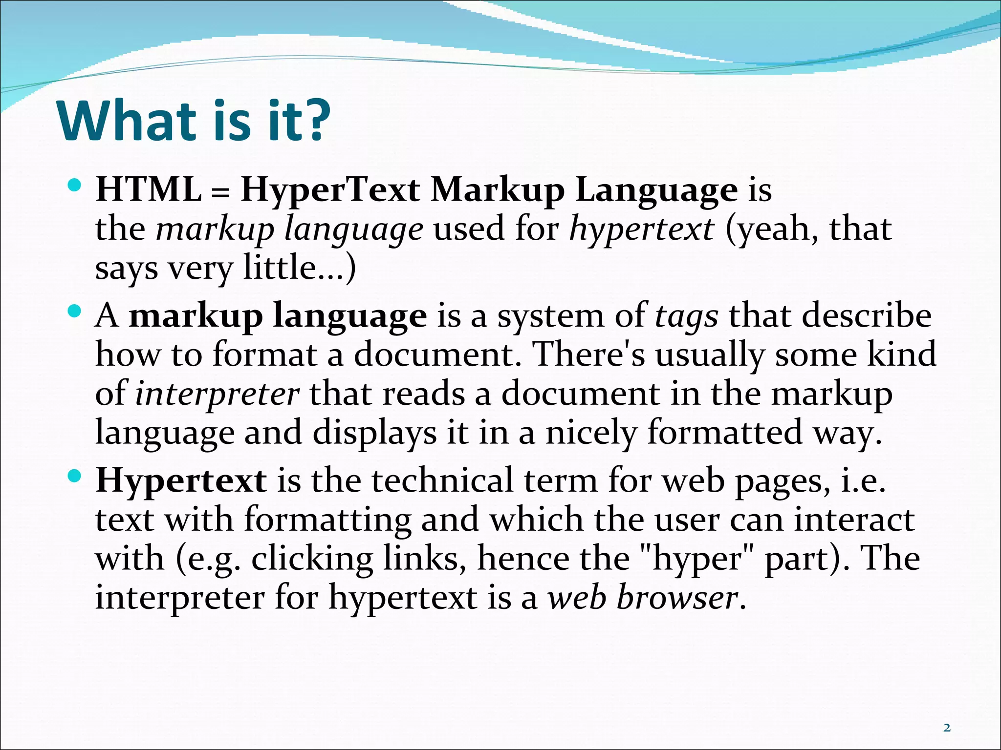 HTML is the markup language used to structure and format web pages. It uses tags to describe how content should be formatted and displayed. Some key HTML tags include paragraph tags (<p>), heading tags (<h1>-<h6>), line break tags (<br>), and horizontal rule tags (<hr>). Links can be added using anchor tags (<a>) that specify a href attribute pointing to a file path or URL. Lists are created using unordered (<ul>) and ordered (<ol>) list tags along with list item (<li>) tags. Formatting can be applied using bold (<b>) and italic (<i>) tags.