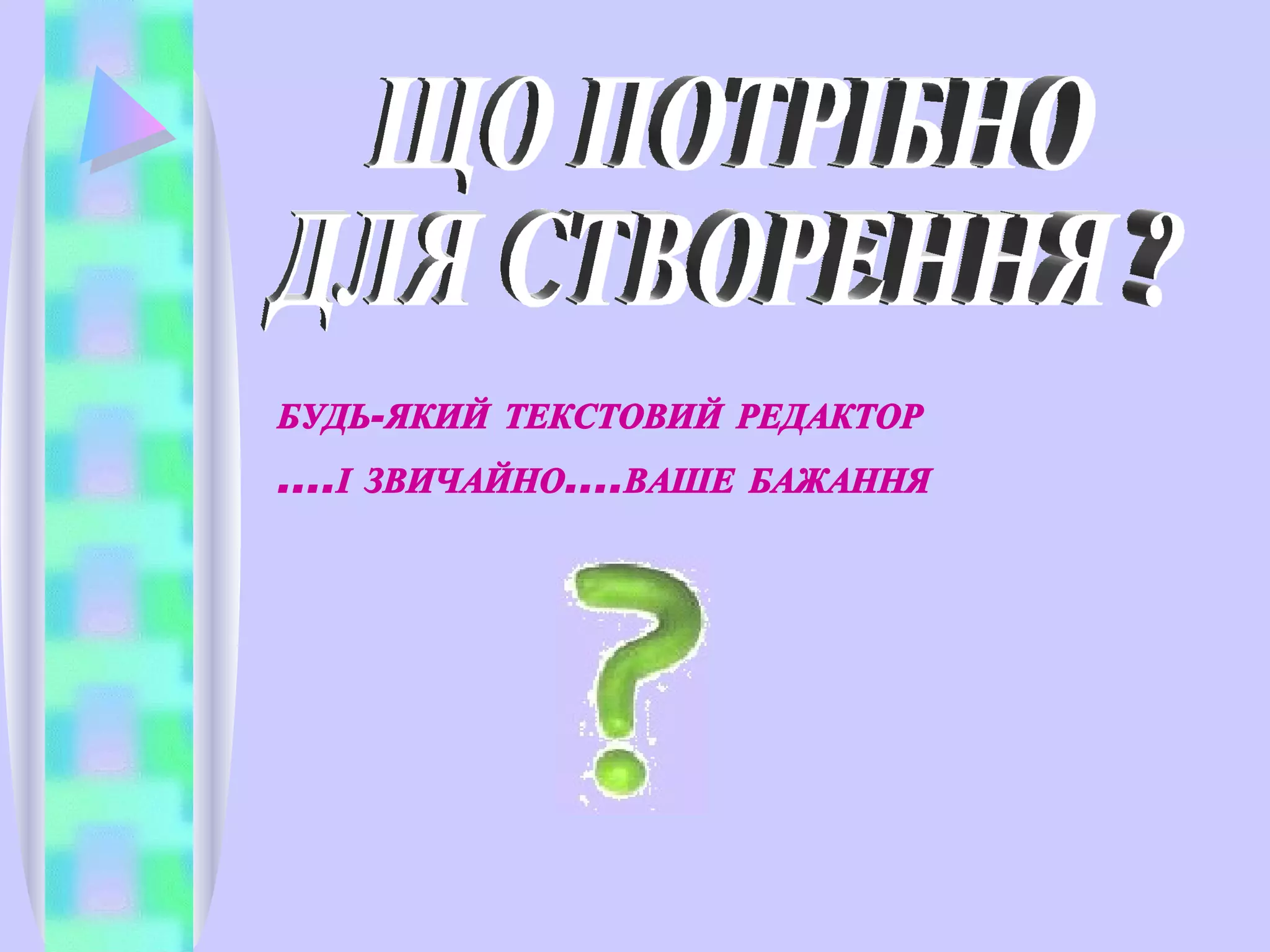 ЩО ПОТРІБНО ДЛЯ СТВОРЕННЯ ? БУДЬ-ЯКИЙ ТЕКСТОВИЙ РЕДАКТОР ....І ЗВИЧАЙНО....ВАШЕ БАЖАННЯ