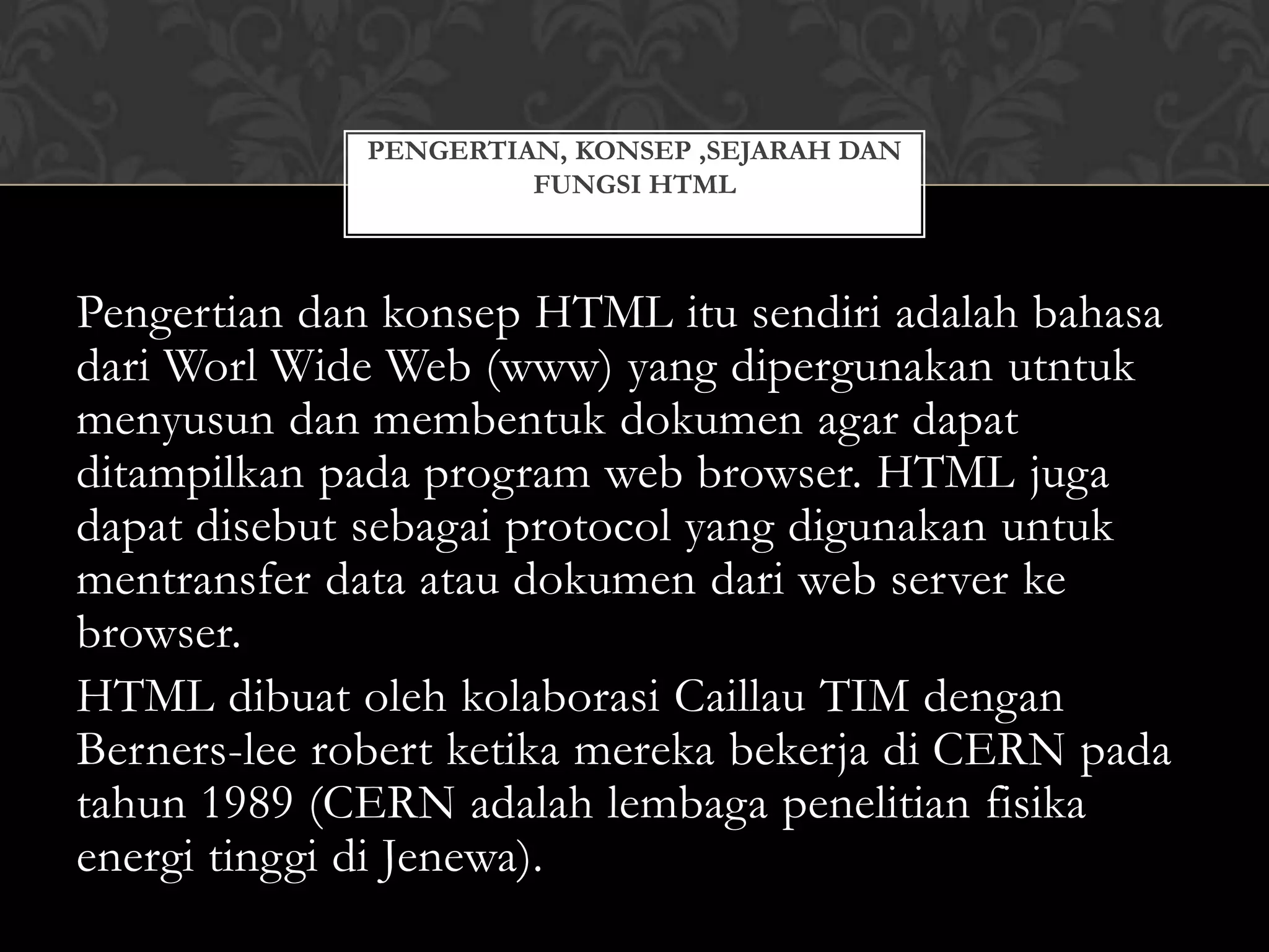 Dokumen ini membahas tentang HTML dan HTML5, menjelaskan pengertian, fungsi, sejarah, serta kemajuan teknologi yang dihadirkan oleh HTML5. HTML merupakan bahasa markup untuk menyusun dokumen di web, sedangkan HTML5 menyempurnakan desain dengan fitur baru seperti media, penyimpanan lokal, dan elemen semantik. Meskipun ada kelebihan seperti dukungan multimedia, HTML5 juga memiliki kekurangan terkait kompatibilitas antar browser.