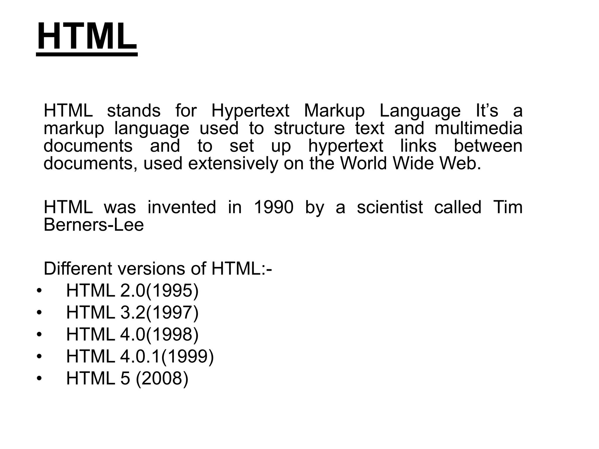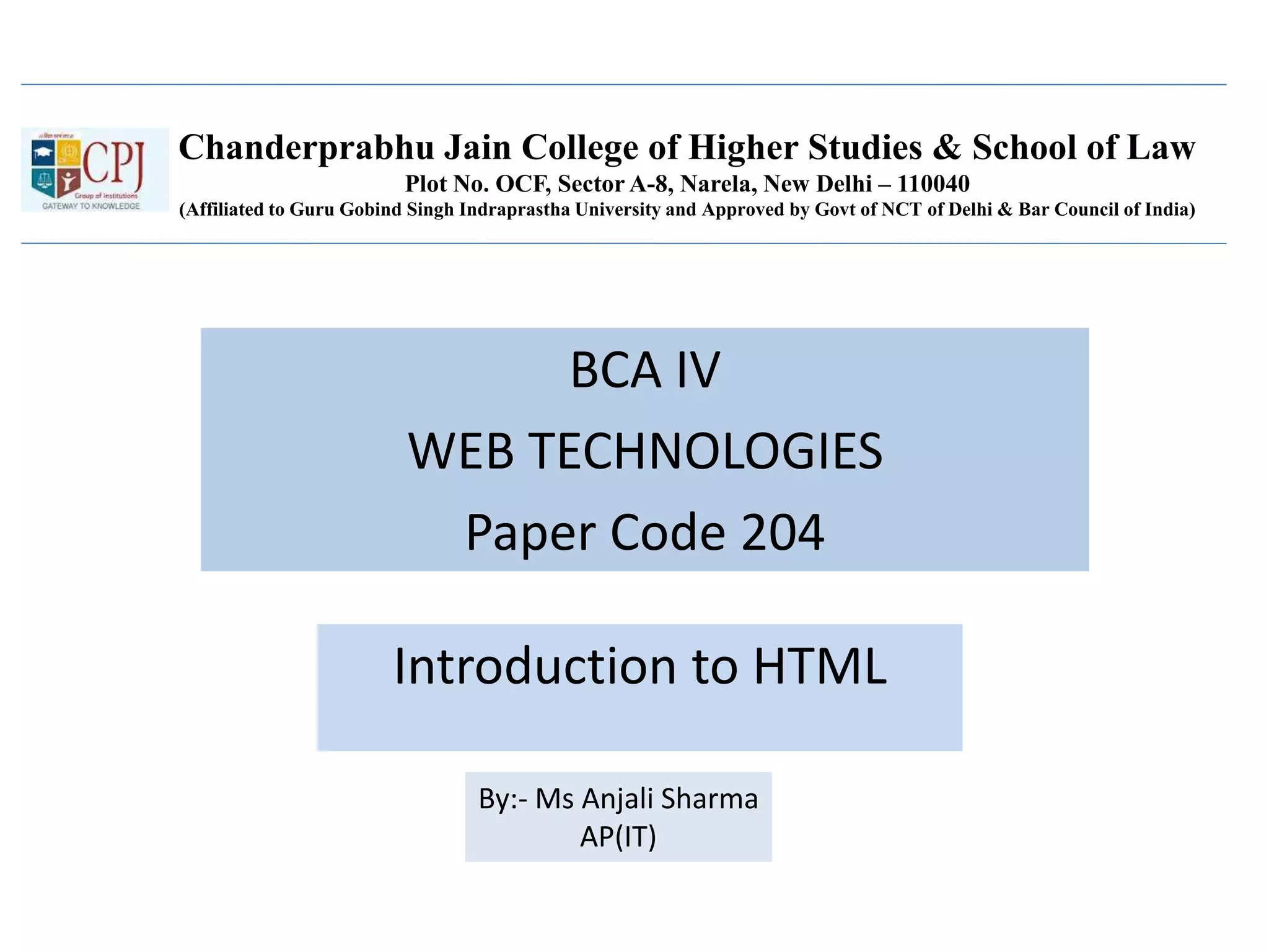 The document provides an introduction to HTML, including its history and different versions. It describes the basic structure of an HTML document and some common tags like <head>, <title>, <body>, comments, attributes, and <meta>. It also discusses formatting tags for text, links, images, and special HTML characters. The document is intended as teaching material for a class on web technologies.