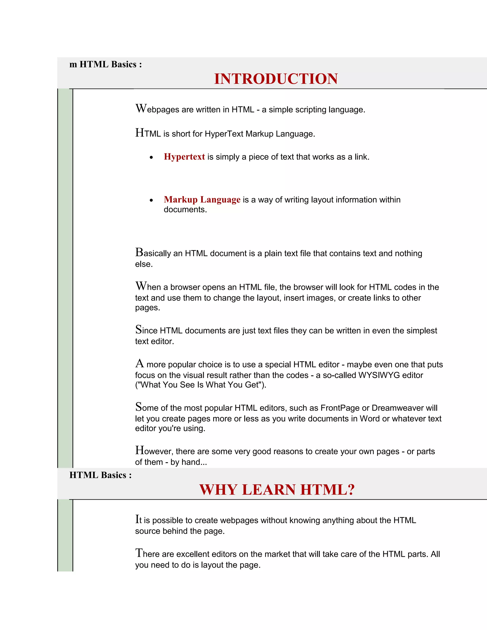- Learning HTML provides benefits like creating custom pages and understanding page code from other websites. The tutorial explains common HTML tags and elements to get started building webpages.