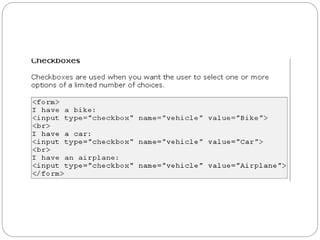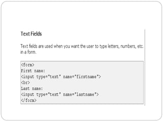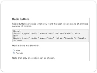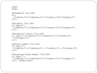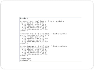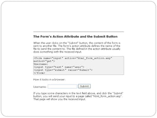 The document provides an introduction to HTML, explaining what HTML is, how to create and view an HTML document, and some basic HTML tags and elements. It discusses how to create a simple HTML file using tags like <html>, <head>, <title>, <body>, and <b> and save it with a .html file extension. It then explains some key HTML tags and elements for headings, paragraphs, line breaks, comments, and attributes. It also covers hyperlinks, frames, tables, and lists.
