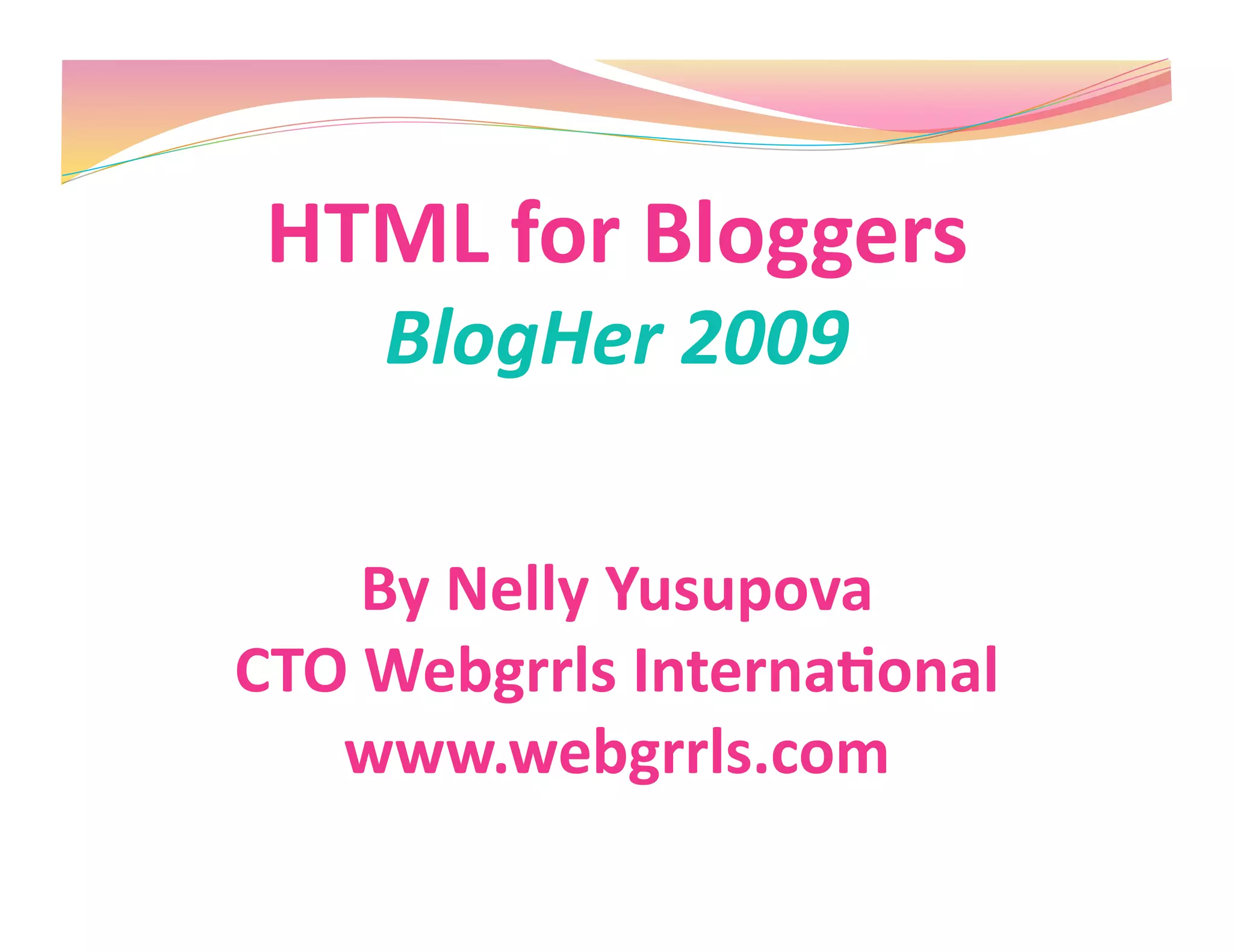 The document is a tutorial on HTML aimed at bloggers, covering basic concepts such as tags, attributes, lists, and tables. It includes examples of HTML code for text formatting, images, links, and lists, as well as resources for further learning. Contact information for the author, Nelly Yusupova, is also provided.