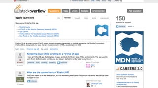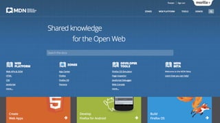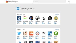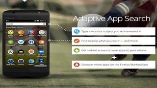 The document discusses the development of mobile applications using Firefox OS, highlighting its open-source nature and compatibility with HTML5, CSS3, and JavaScript. It outlines various web APIs available for developers, including regular, privileged, and certified APIs, and provides code snippets for implementing features like geolocation and ambient light sensing. The document also offers resources for developers, such as simulators and tools, to aid in building Firefox OS applications.