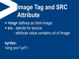 The <img> tag is used to define images in HTML. It contains a src attribute to specify the image URL and optional alt text if the image fails to load. Width and height attributes can specify pixel or percentage dimensions. Images can be aligned within text using the align attribute with values of top, middle, bottom. The align attribute can also float images left or right of a paragraph. Additional attributes like hspace, vspace add spacing around images, and background inserts a background image. The <a> tag can turn an image into a link.