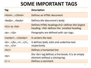 HTML (Hypertext Markup Language) is the standard markup language used to create web pages. HTML uses tags to define elements like paragraphs, headings, links, images, and tables. Common tags include <p> for paragraphs, <h1> - <h6> for headings, <a> for links, <img> for images, and <table> for tables. HTML pages can also include styles, lists, forms, iframes and other elements. Well-formed HTML code ensures web pages display properly across different browsers.