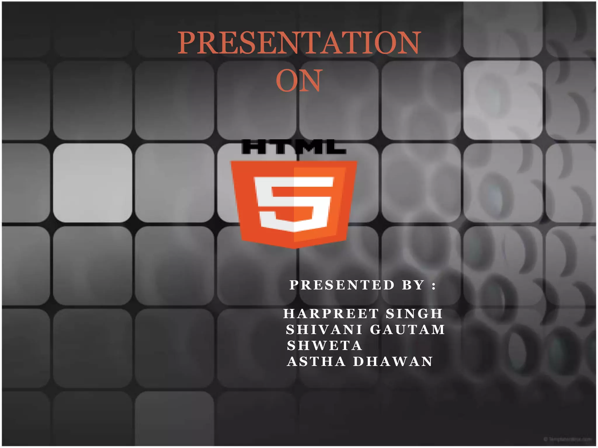 This presentation provides an overview of HTML and HTML5. It discusses the history and invention of HTML by Tim Berners-Lee in 1989. It describes the basic building blocks of HTML including elements, attributes, and data types. It then covers versions of HTML from 2.0 to 5 and new features in HTML5 like canvas, video, geolocation, app cache, and web workers. The presentation compares differences between HTML4 and HTML5 and provides examples of websites using HTML5.