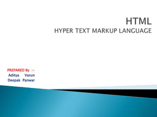 HTML (Hypertext Markup Language) is the standard markup language used to create web pages. HTML uses tags to define the structure and layout of a web page. Some key HTML elements include headings, paragraphs, links, images, and lists. Attributes provide additional information about HTML elements and are specified in start tags. Common attributes include href for links, src for images, and style for formatting. HTML documents have a specific structure with a DOCTYPE, html, head, and body tags.