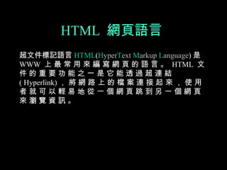 DOWN.HTM 的網頁。 • 標籤的特性是成對出現的而且第 2 個標 籤要有 / 符號,表示標籤結束。例如第 1 行的 <HTML> 和第 26 行的 </HTML> 。 第 2 行的 <HEAD> 標籤和第 8 行的 </HEAD> 標籤,第 9 行的 <BODY> 標 籤和第 25 行的 </BODY> 標籤。標籤間 的內容就是資料。