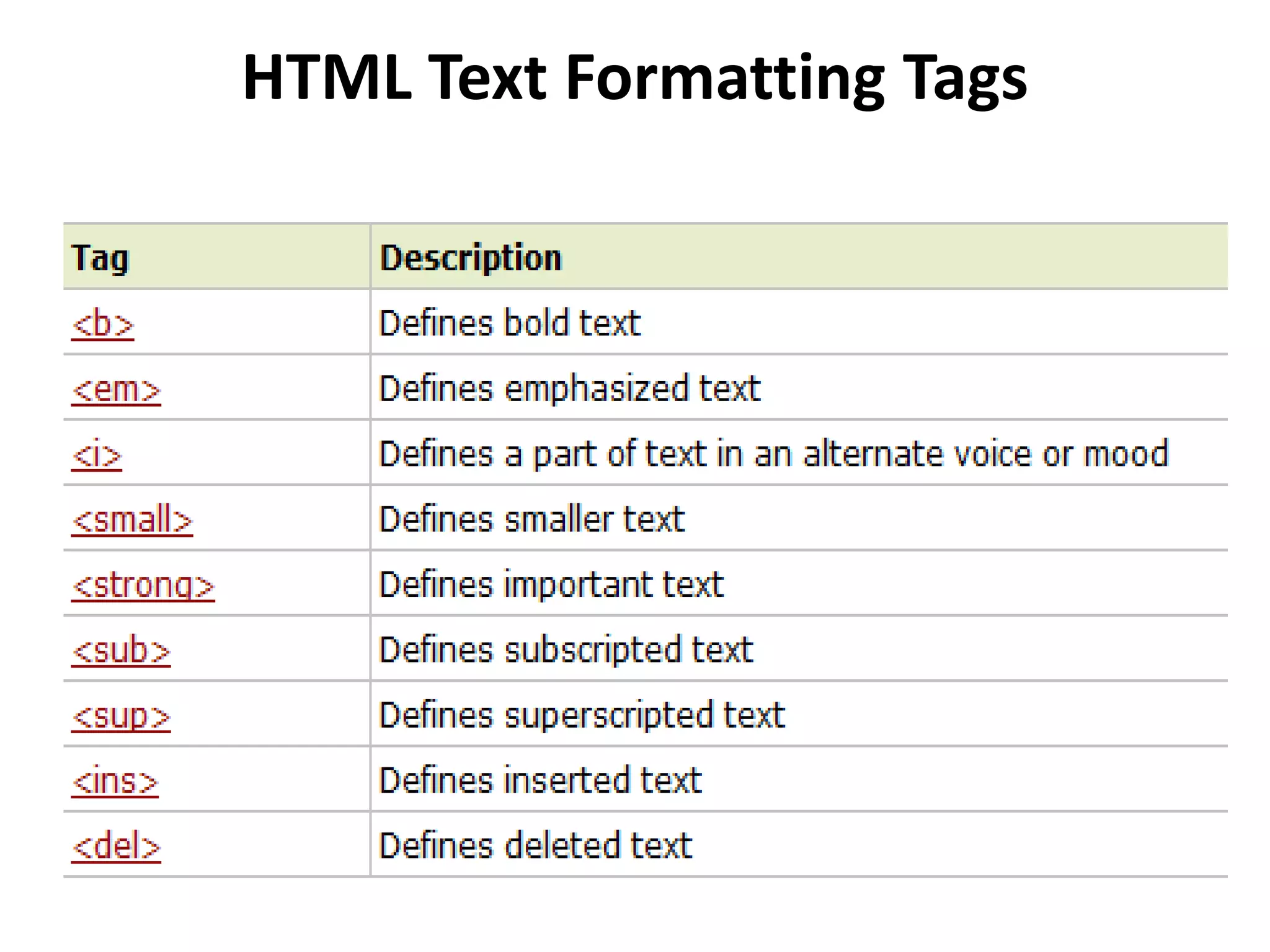 The document describes various HTML tags for formatting text, adding links, and including metadata in web pages. It provides examples of tags like <b> for bold text, <a> for creating links, <title> for the page title, <head> for including scripts and stylesheets, and <meta> for metadata. It also explains how tags like <link> and <style> are used to reference external stylesheets and define internal styles.