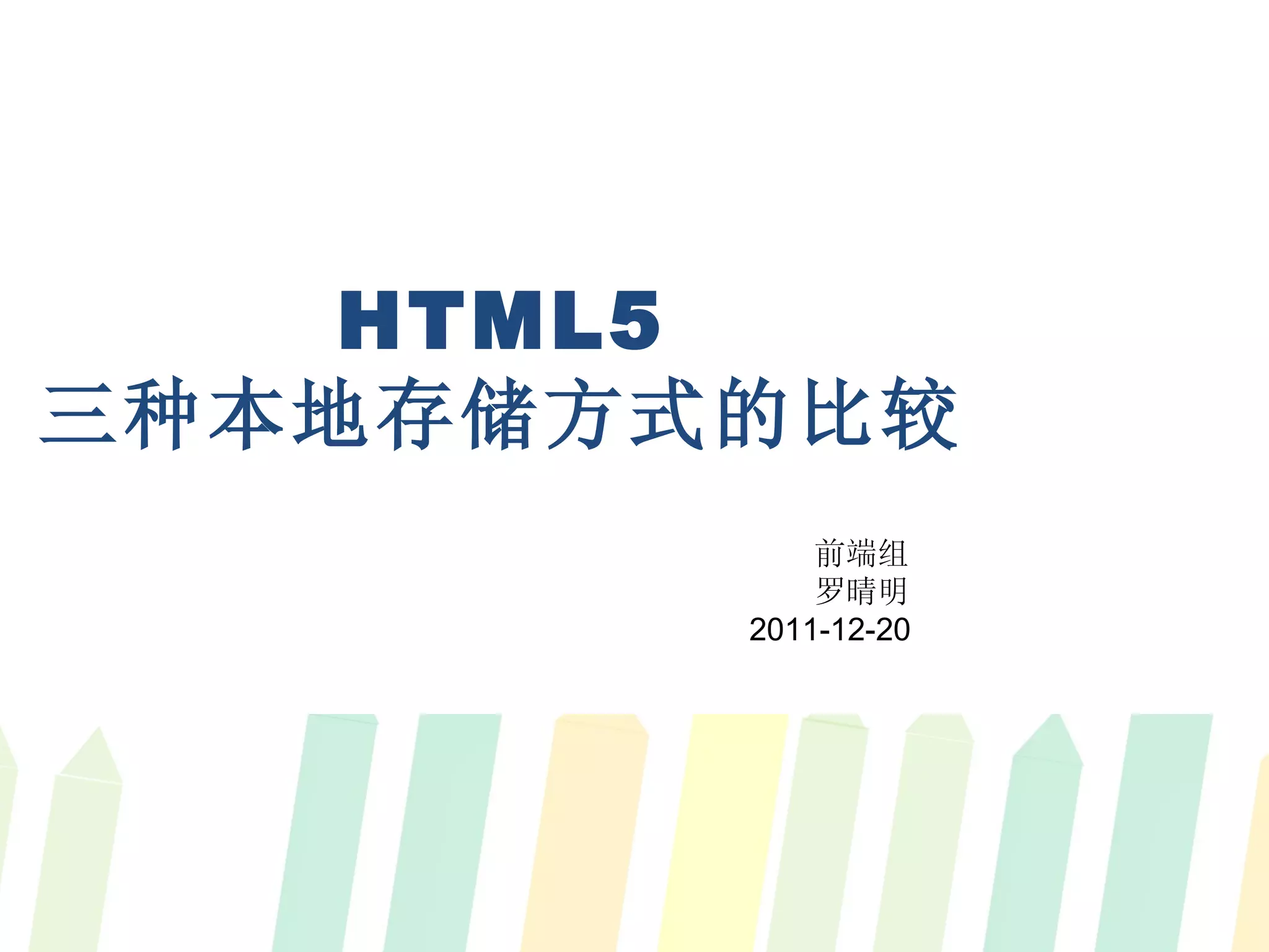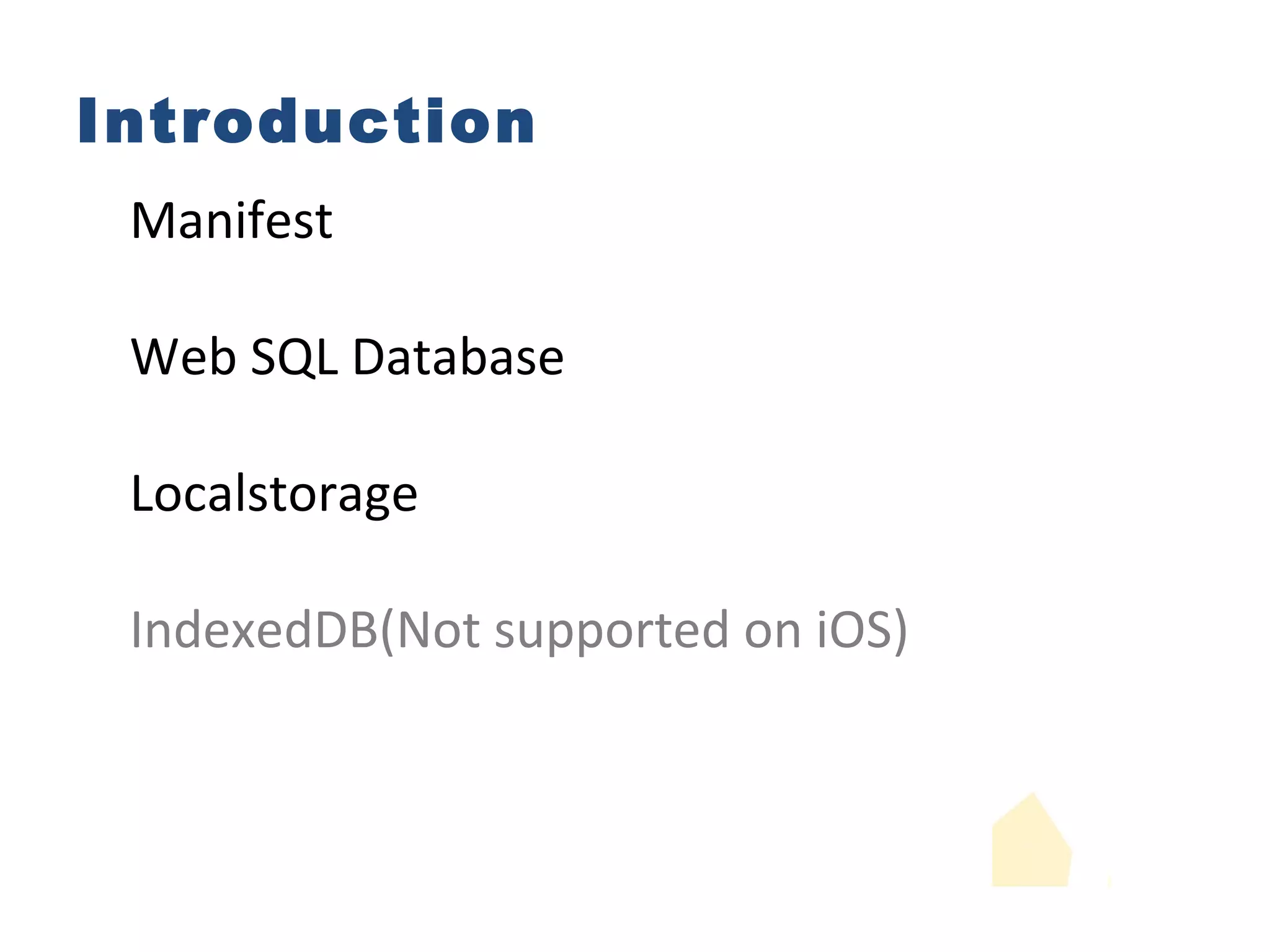 The document compares three local storage mechanisms for the front end: Manifest, Web SQL Database, and LocalStorage.