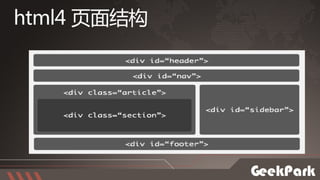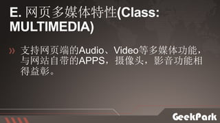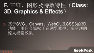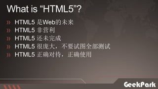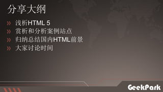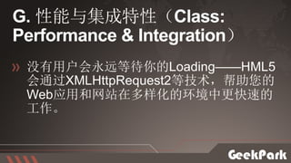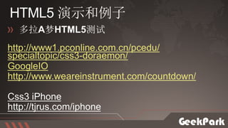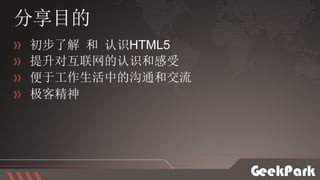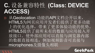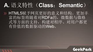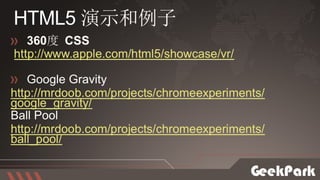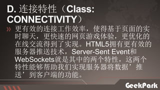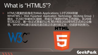 文档介绍了 HTML5 的新特性,包括增强的网页性能、支持视频和音频的标签以及本地数据库功能。新的元素和属性如 section、video 和 datetime 被引入,并且一些旧元素被移除。文档还提供了对 HTML5 特性的动态展示链接。