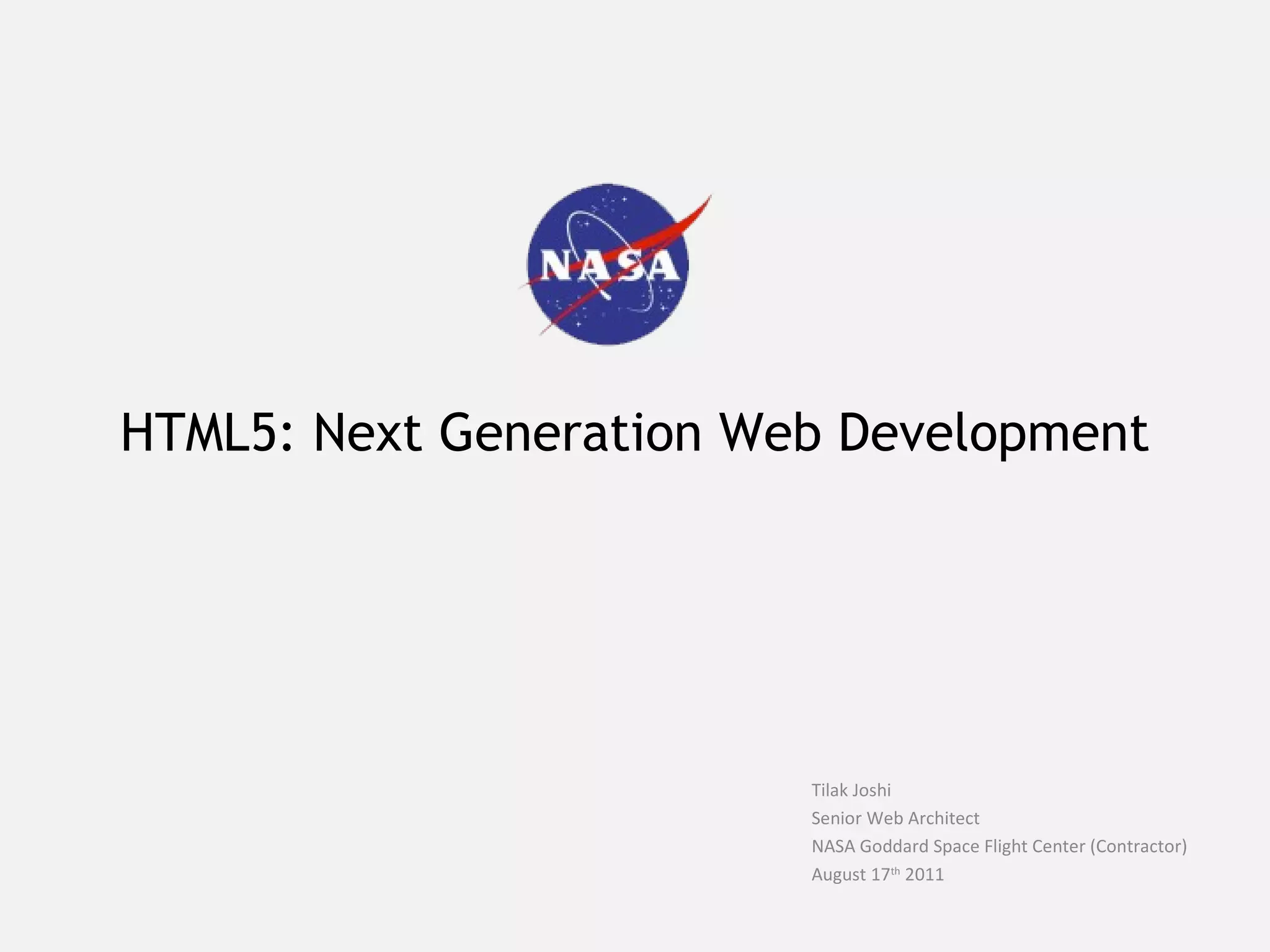 HTML5 is the next generation web development standard that improves upon HTML4 and XHTML. It focuses on features rather than syntax, and includes new elements like <article> and <section>, native audio/video support, drawing APIs, geolocation, drag and drop, web forms 2.0, and more. HTML5 aims to improve multimedia capabilities while keeping code readable by humans and machines. It is supported by all major browsers, though support for specific features may vary, and polyfills can help with backwards compatibility.