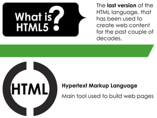 HTML5 is the latest version of HTML that allows for richer content on the web compared to previous versions. It is still being developed but provides features for video, audio, and interactivity that overcome limitations of prior standards. HTML5 works together with CSS and JavaScript to support development of content that can be deployed across devices like smartphones and tablets through browsers. This makes HTML5 well-suited for mobile learning applications since it allows learning content to be accessed directly on mobile devices without additional software.