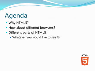The document discusses the significance of HTML5 as a universal UI technology, detailing its functionalities and cross-browser compatibility challenges. It covers various HTML5 features such as semantic markup, input elements, CSS3 enhancements, multimedia support, and storage options, along with development tools like Modernizr and polyfills. The presentation emphasizes HTML5's future potential and the necessity for developers to utilize feature detection and polyfills to enhance user experience across different devices and browsers.