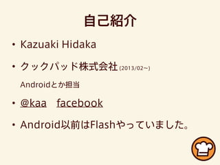 クックパッド株式会社(2013/02∼) Androidとか担当 • @kaa facebook • Android以前はFlashやっていました。