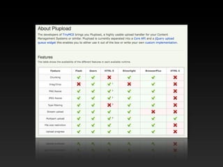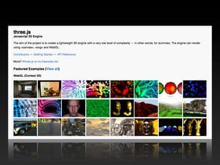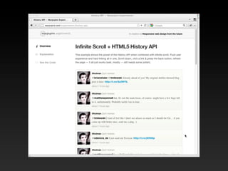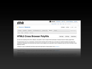 The document provides an overview of various HTML5 APIs including web storage, offline web applications, geolocation, the history API, web sockets, the file API, video, canvas, and more. It includes code examples demonstrating how to use sessionStorage, localStorage, offline caching manifests, geolocation, pushState, web sockets, reading files, drawing to canvas, and other APIs. The document is intended to introduce developers to new capabilities provided by HTML5.