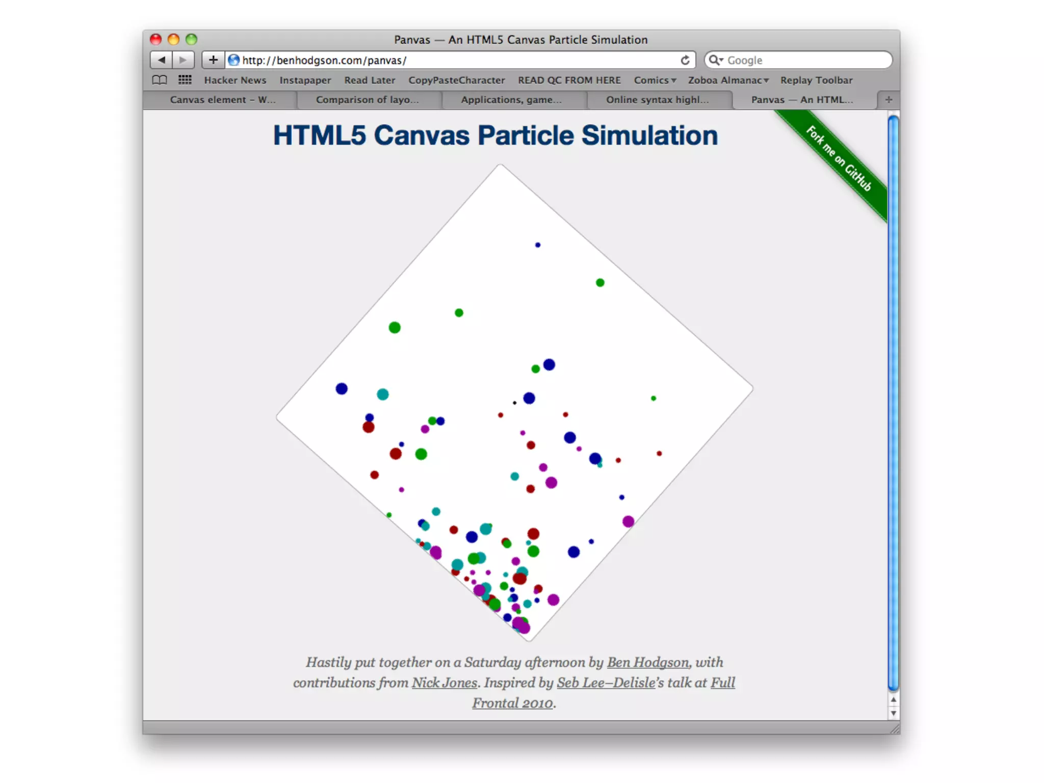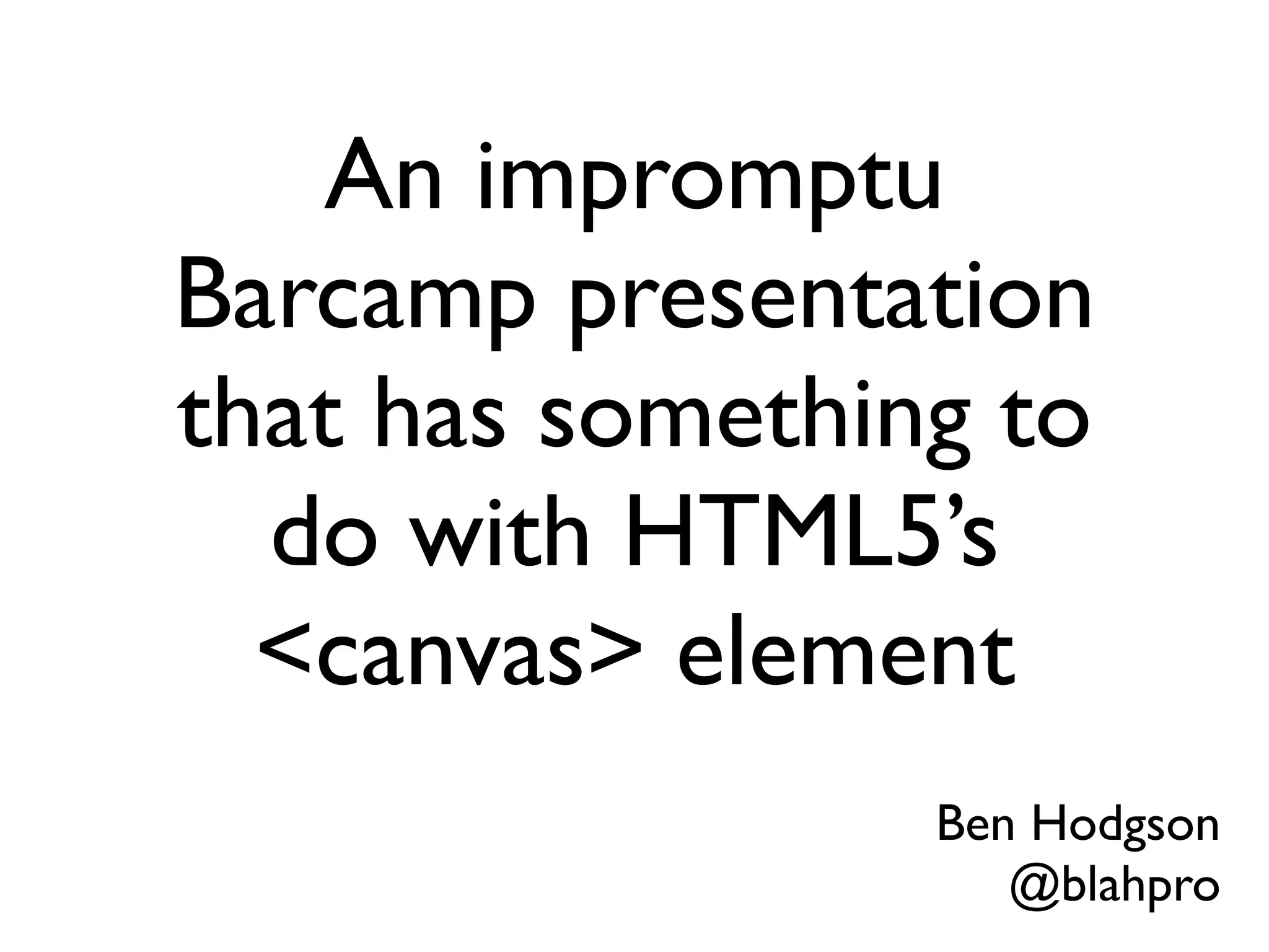 This document summarizes an impromptu presentation about using the HTML5 <canvas> element to create particle simulations in JavaScript. Key points: