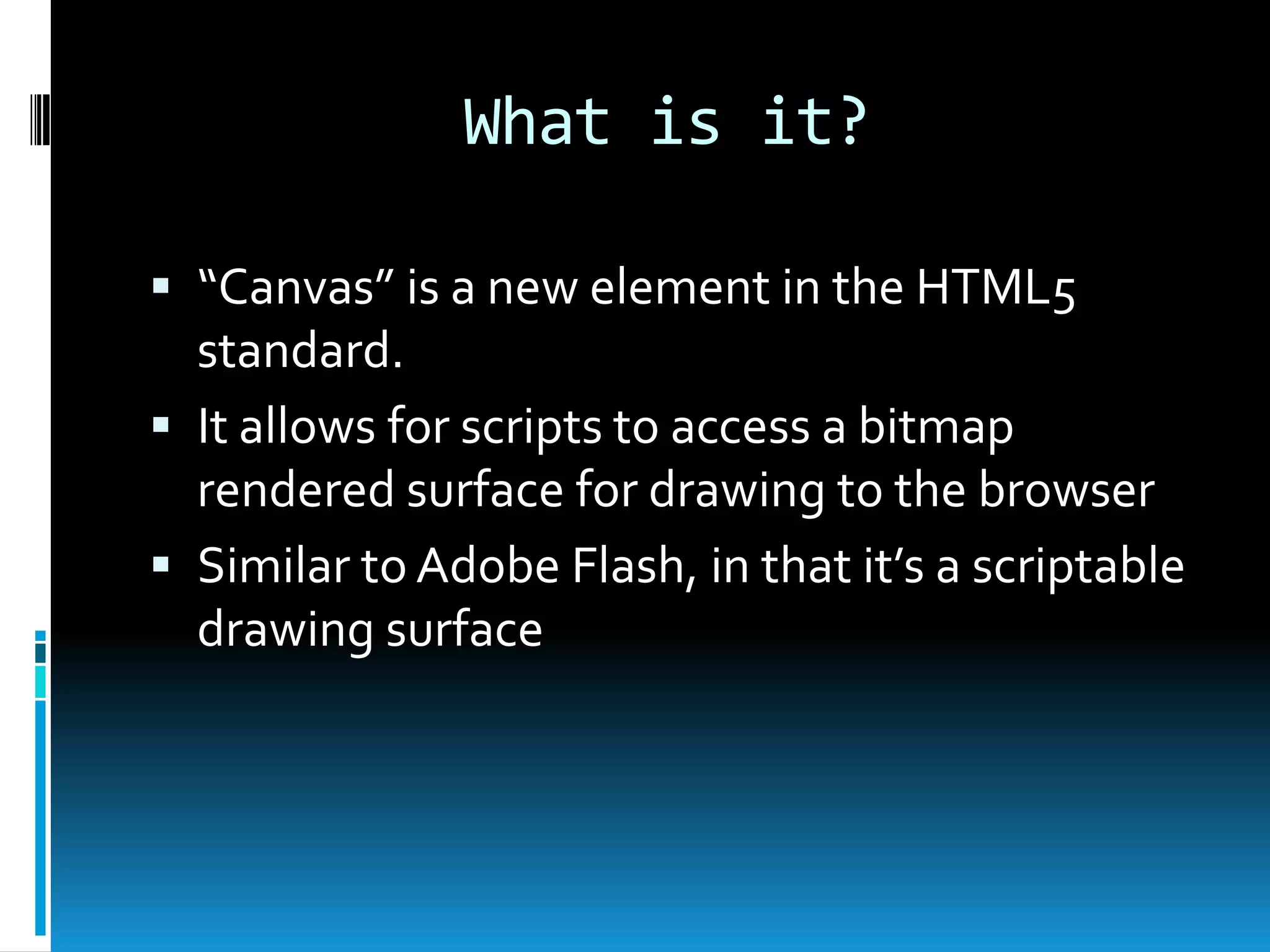 The HTML5 Canvas element allows scripts to access a bitmap rendered surface for drawing graphics via JavaScript. It provides a simple syntax using <canvas> tags with width and height attributes. Canvas drawing is rendered as a bitmap and is resource dependent, but offers advantages like being native to browsers without requiring plugins. While purely scripted, it is a W3C standard and examples demonstrate its capabilities for animations and interactive experiences.