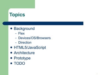The document discusses the evolving landscape of mobile operating systems and the transition towards HTML5 and web technologies as key components for mobile app development. It highlights the fragmentation of the mobile OS market and outlines various tools, frameworks, and development environments available for building mobile applications. The author emphasizes the advantages of using HTML5, particularly in supporting multiple devices and platforms, while also comparing existing frameworks like Dojo, Sencha Touch, and jQuery Mobile.
