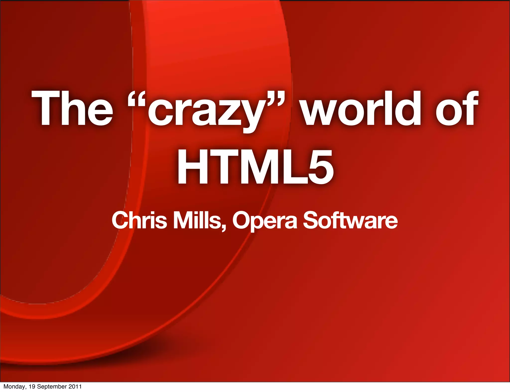 The document provides an overview of HTML5, including its history, new semantic elements like <header> and <article>, improved forms capabilities with built-in validation, and error handling standardized in the specification. It discusses both benefits like leaner markup and criticisms like incomplete browser support for new features. Examples are given throughout to illustrate new HTML5 syntax and capabilities.