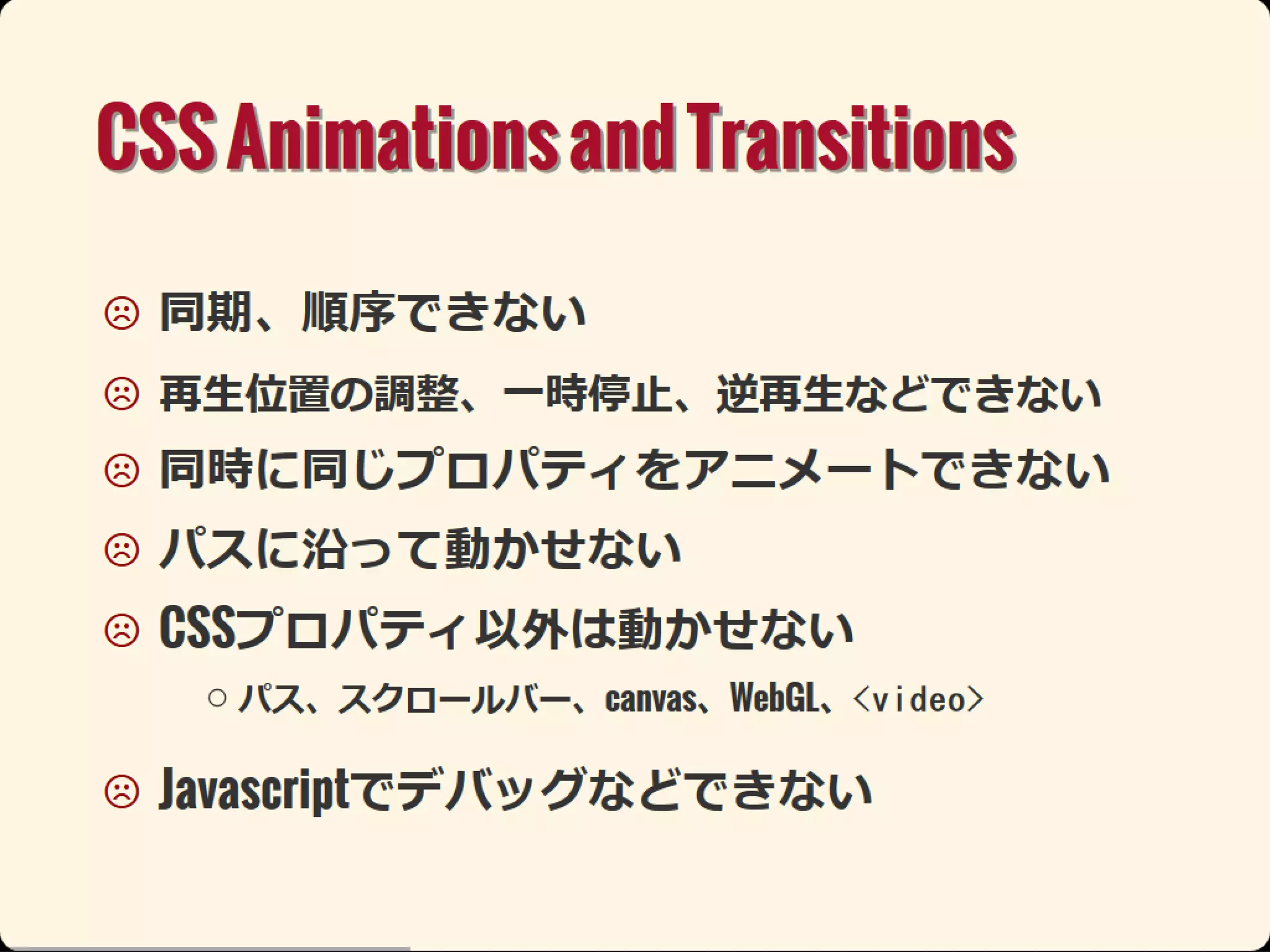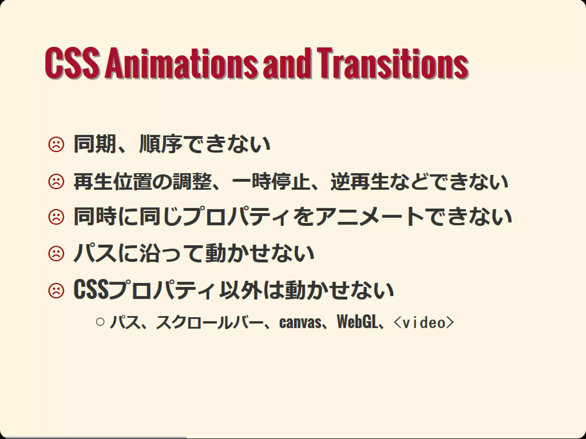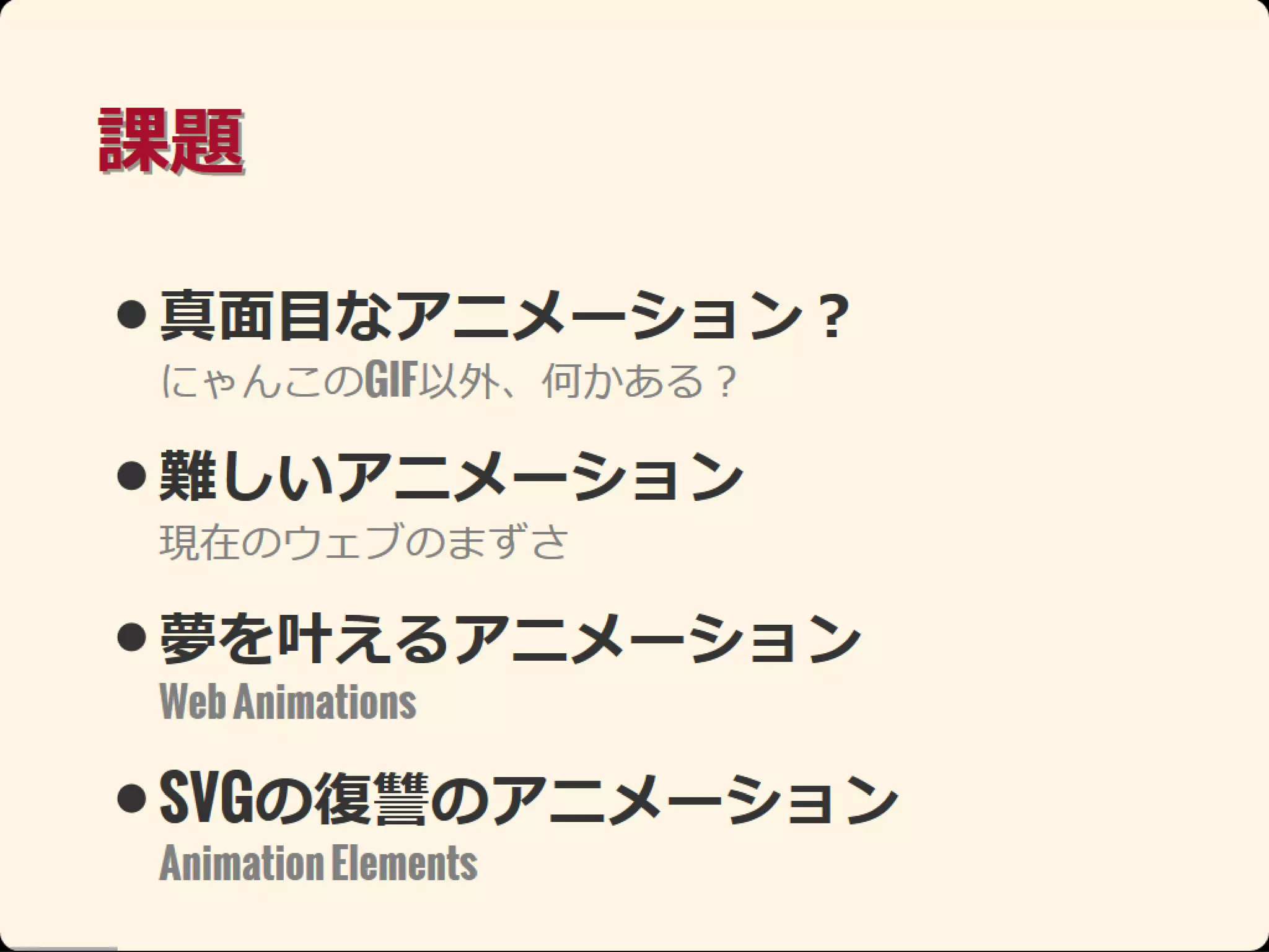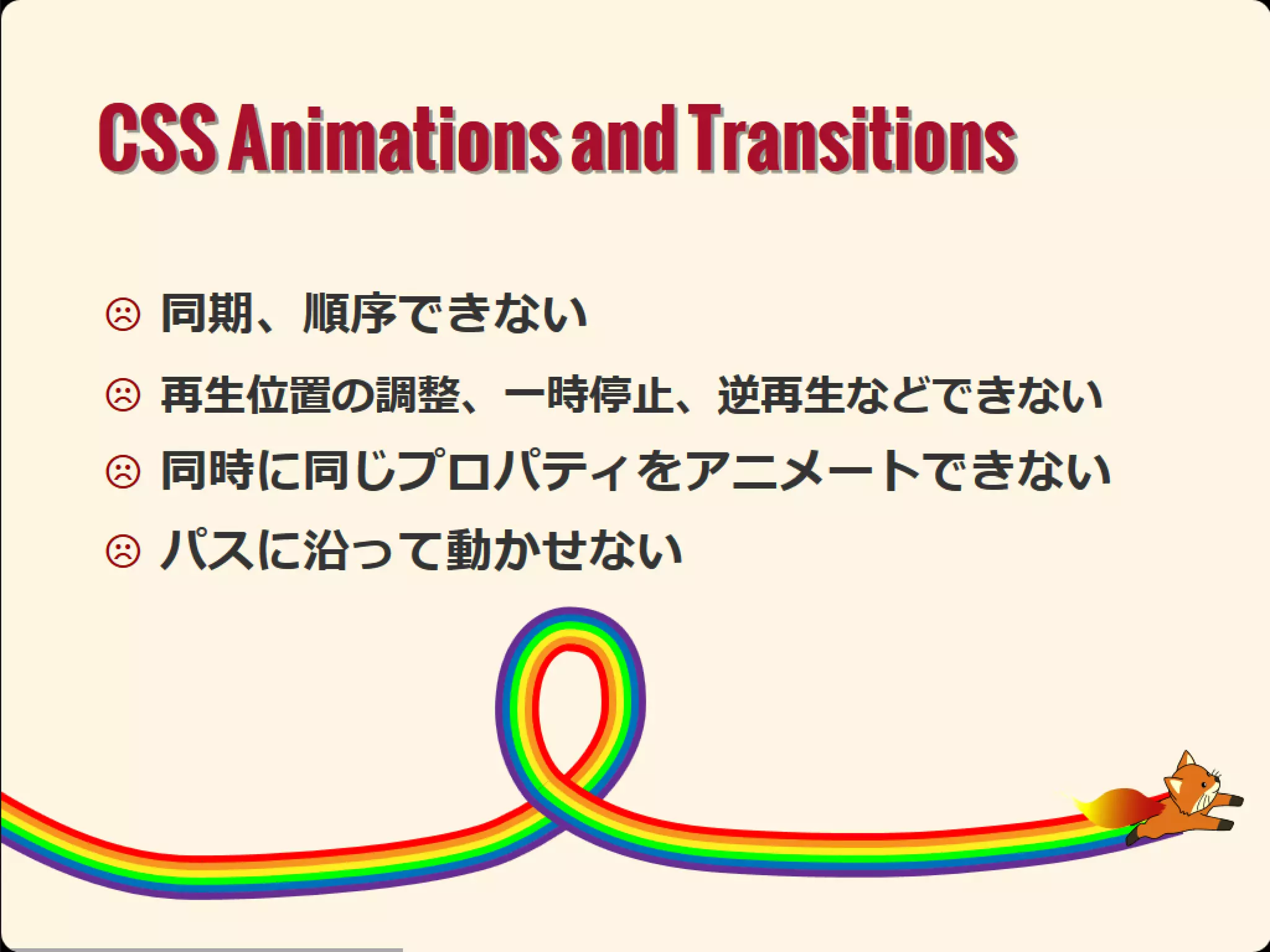 アニメーションの重要さ、現在のウエブプラットホームの弱点、Web Animationsの機能とそのAPIの基本的な使い方、Animation Elementsというスペックなどの紹介です。