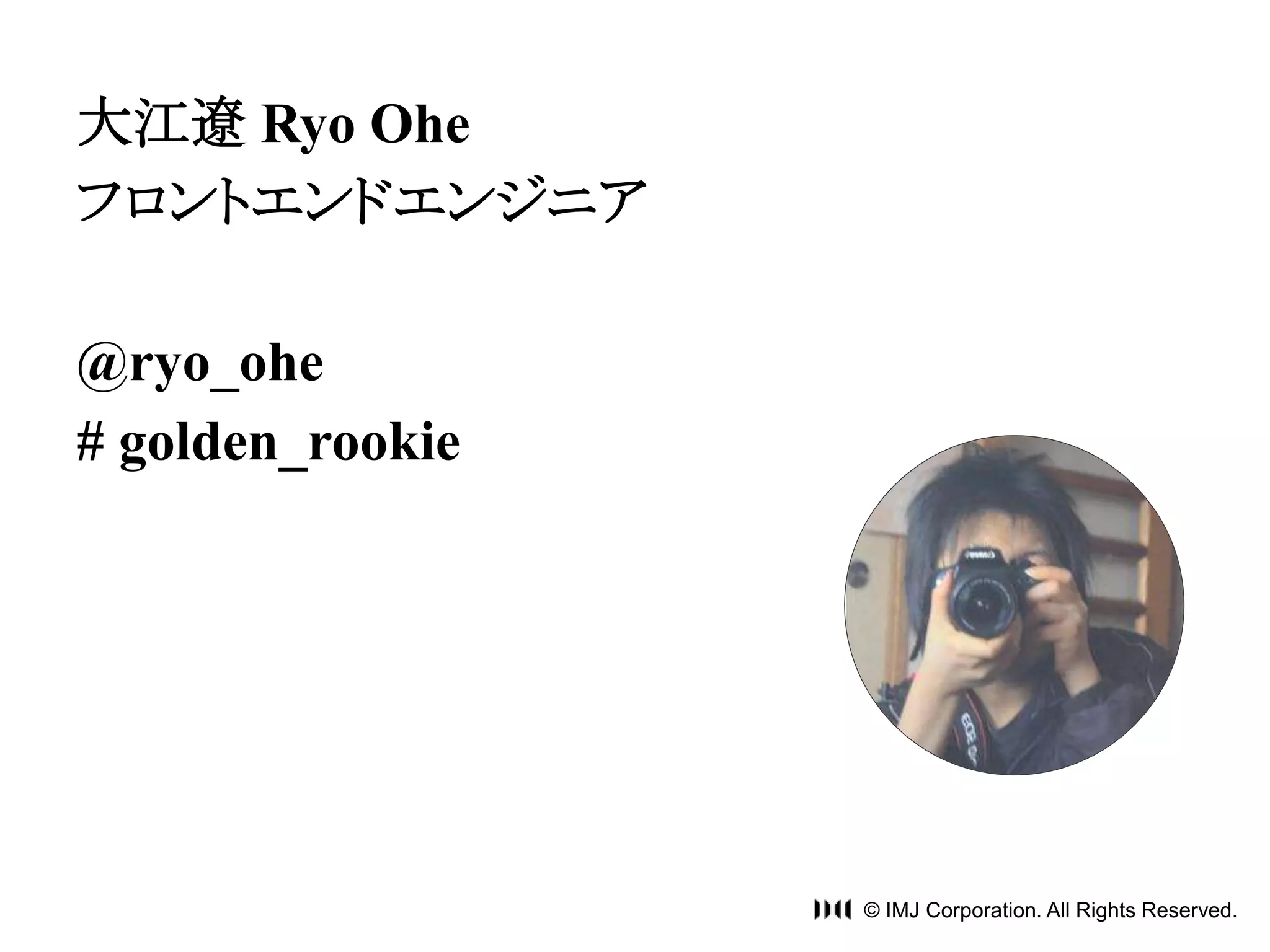 まずは自己紹介しようと思います。 大江遼と申します。 現在、株式会社アイ・エム・ジェイで、 フロントエンドエンジニアとしてHMTLやJSを書いたりしています。 時間もあまりないので、さっそく本題に入りたいと思います。