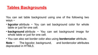 Note − The bgcolor, background, and bordercolor attributes