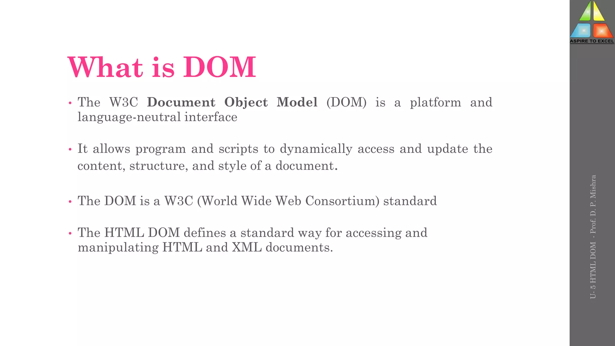 The document discusses the Document Object Model (DOM) which defines a standard way to access and manipulate HTML, XML, and HTML documents. It defines everything in an HTML document as nodes - the document itself is a document node, elements are element nodes, attributes are attribute nodes, and text is text nodes. The DOM allows programs and scripts to dynamically access and update the content, structure, and style of documents.