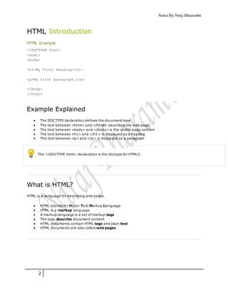 This document provides an introduction to HTML and teaches the basics of creating web pages using HTML. It explains key HTML elements and tags like <html>, <body>, <h1>, <p>, and <img> and how they are used to structure an HTML document and define headings, paragraphs, links and images. The document also covers HTML attributes, headings from <h1> to <h6>, empty elements like <br>, and the importance of properly opening and closing all HTML tags.