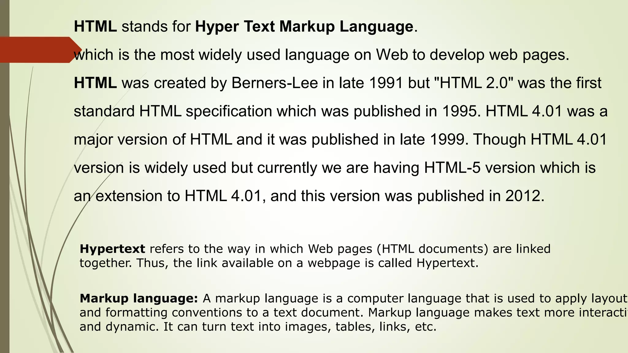 HTML is a markup language used to structure and present content on the web. It stands for Hypertext Markup Language and was created by Tim Berners-Lee in 1991. Some key elements of HTML documents include tags, attributes, and basic building blocks like the <html>, <head>, <title>, and <body> tags. Common tags in HTML are used for formatting text and include headings, paragraphs, breaks, fonts, and lists.