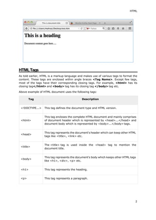 HTML (Hypertext Markup Language) is the standard markup language used to create web pages. It uses tags to define headings, paragraphs, lists and other elements. Originally developed to share scientific information, HTML is now widely used to format web pages using tags like <html>, <head>, <body>, <h1>, <p>, <br>, and <img>. HTML documents have a basic structure including a <DOCTYPE> declaration, <html> and <body> tags which contain other tags to define and structure the content.