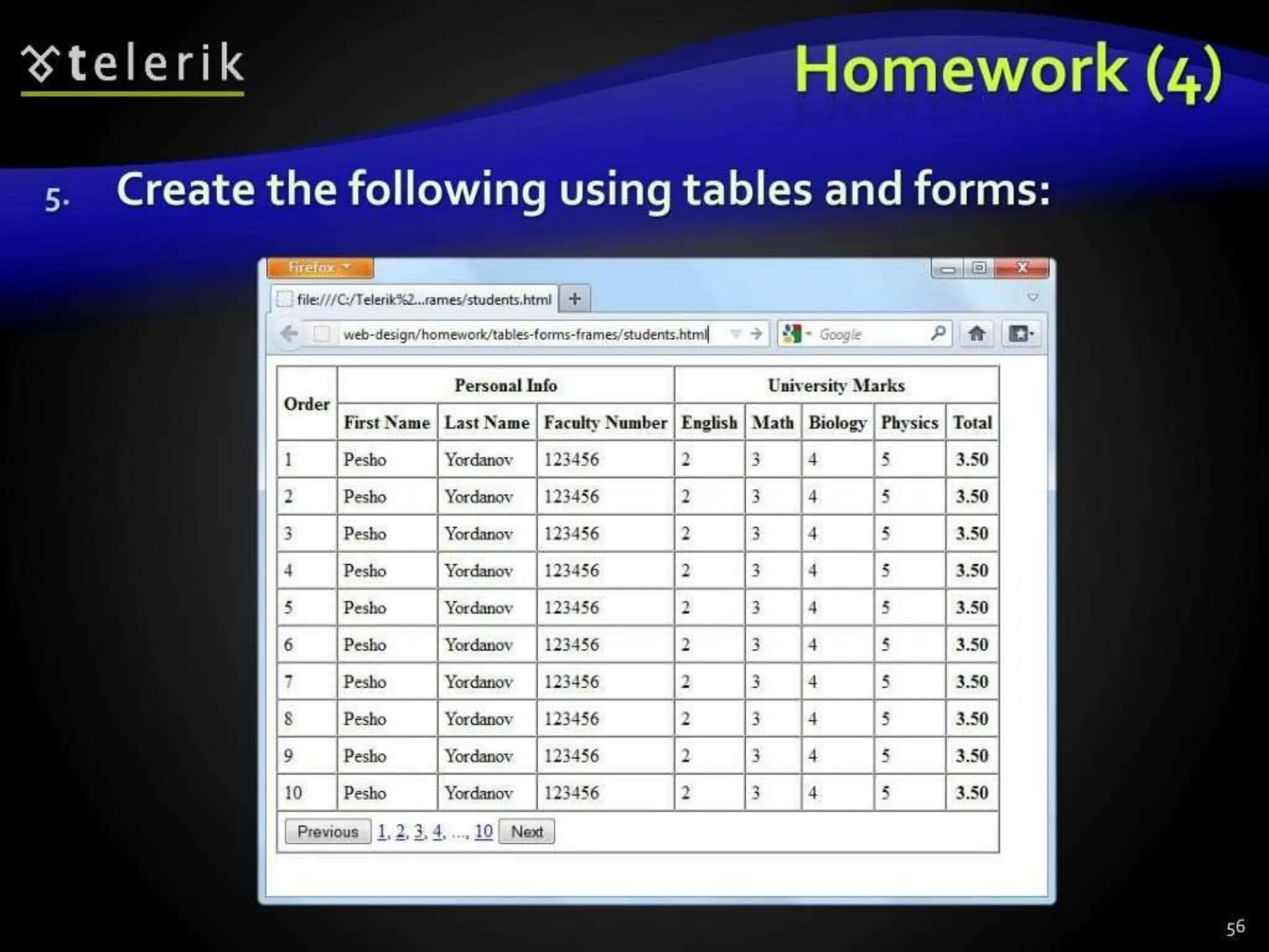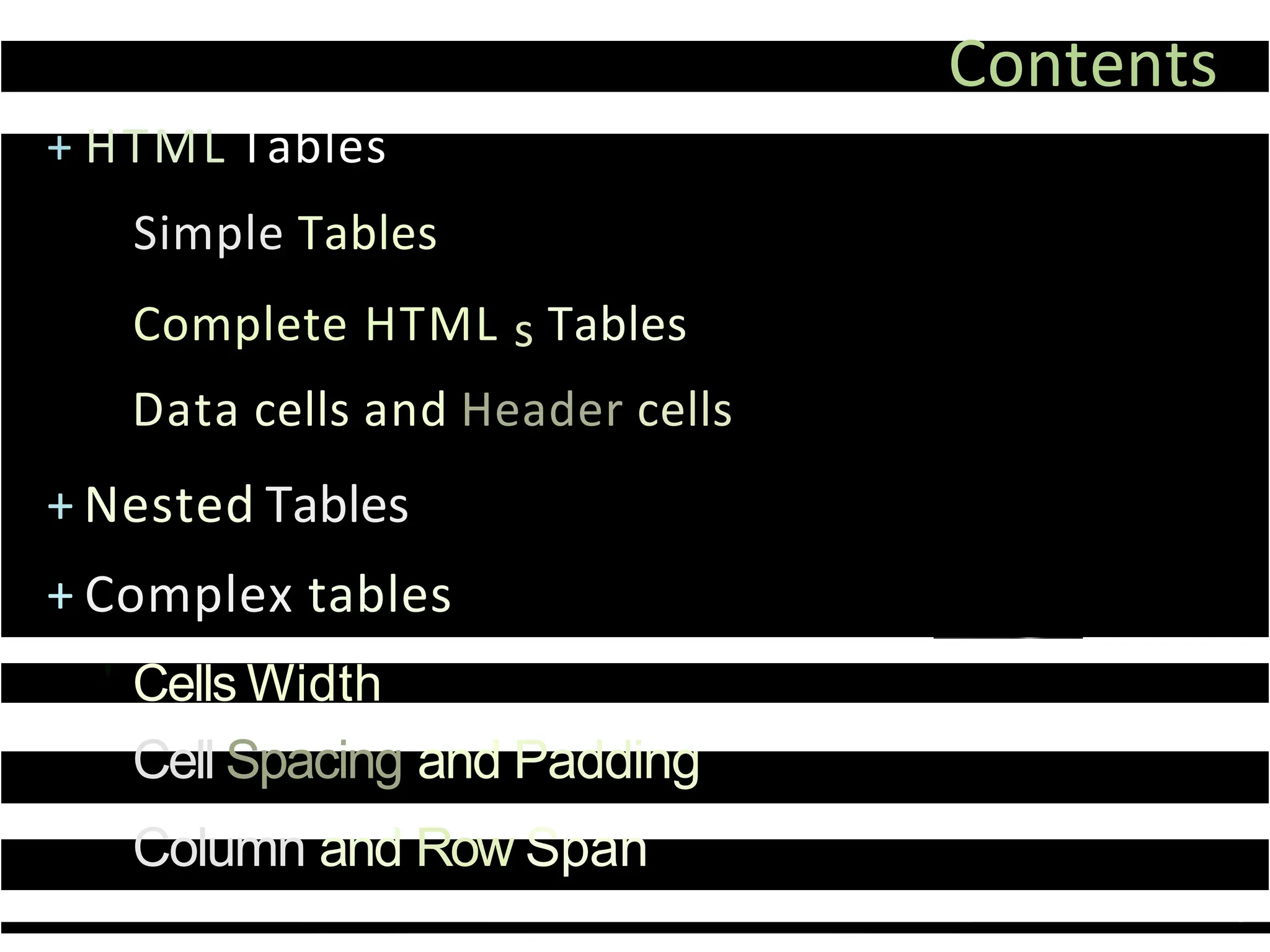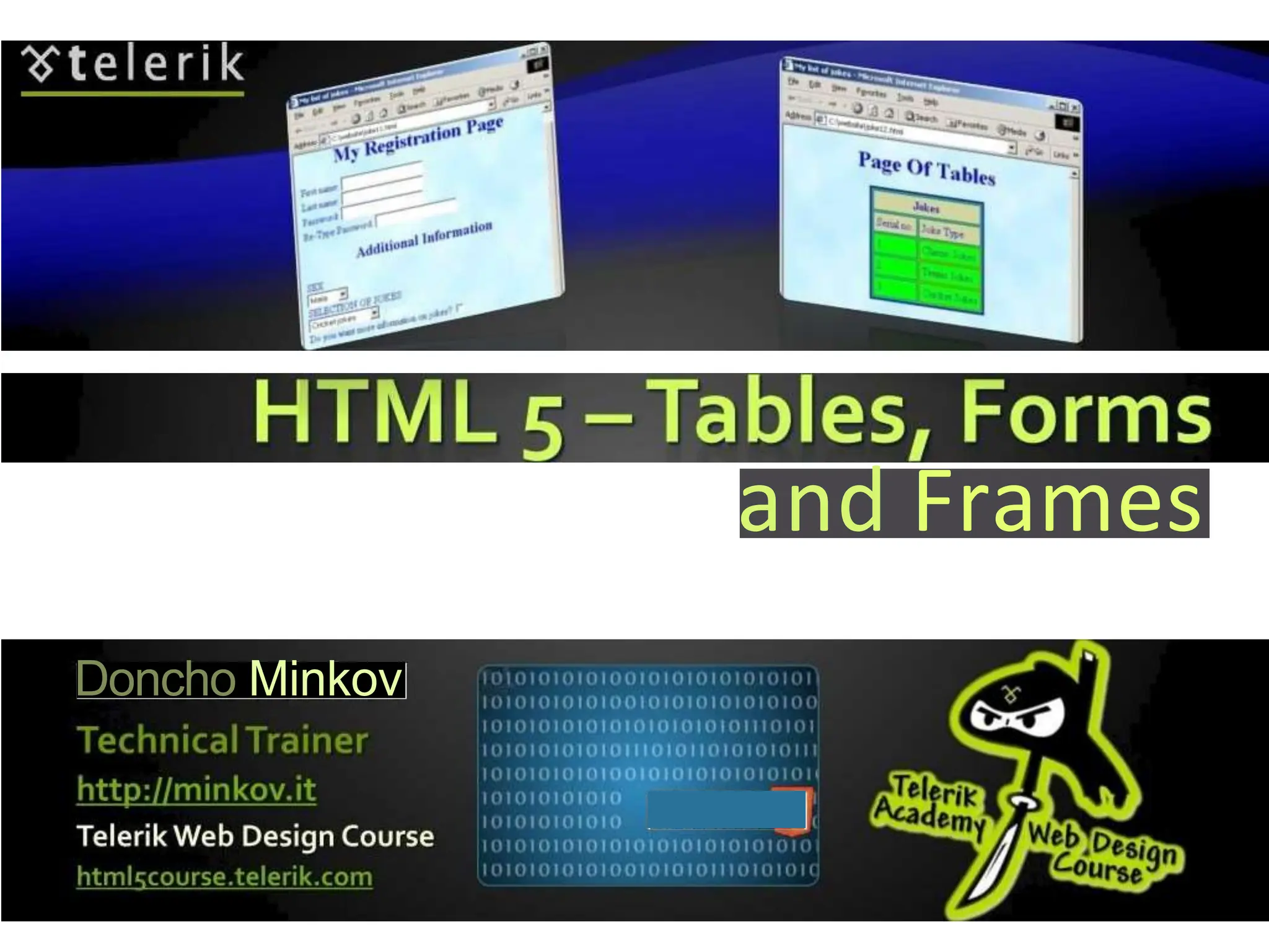 The document provides information about HTML tables, forms, and frames. It discusses the basic structure and tags used to create tables, as well as more advanced table features like header and footer sections, column and row spanning, and nested tables. It also covers the various form field types like text boxes, buttons, selects, and provides examples of how to use them. Finally, it provides a brief overview of frames, noting they are no longer widely used due to compatibility issues.