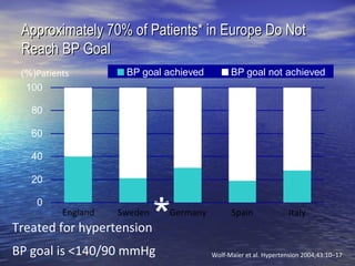 Hypertension is often difficult to treat effectively despite available drugs. Combination drug therapy is usually needed to control blood pressure, as monotherapy is only effective in 40-60% of patients. Using two drugs with different mechanisms of action can more effectively lower blood pressure than monotherapy alone. Common effective combinations include a diuretic paired with a renin-angiotensin system inhibitor, calcium channel blocker, or beta blocker. This helps control blood pressure through multiple pathways and limits side effects.