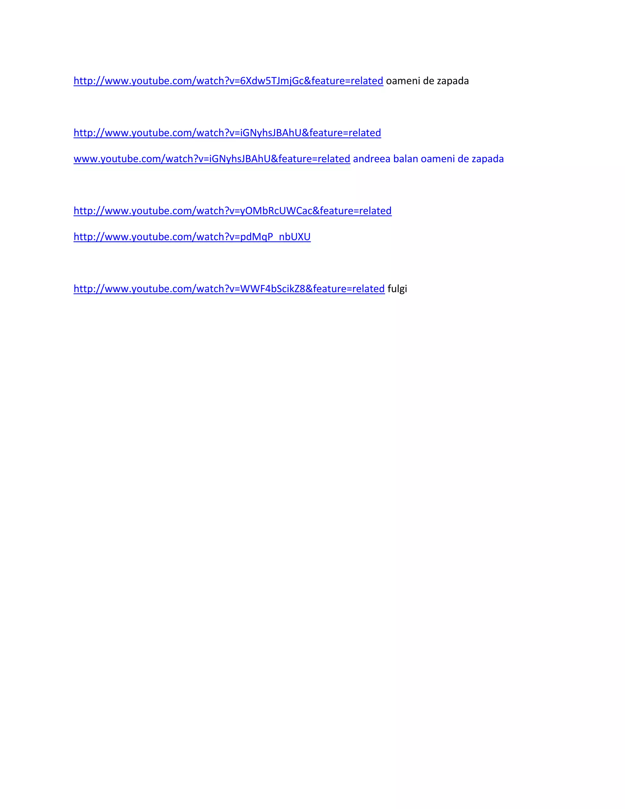 The document contains links to several YouTube videos featuring people making snowmen and playing in the snow. Some of the videos are of the singer Andreea Balan and her music video "Oameni de zapada" (Snowmen). Other videos show snow falling and people enjoying winter weather.