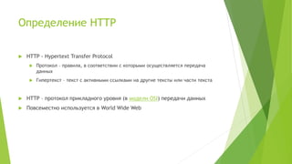Документ представляет собой подробный обзор протокола HTTP, включая его назначение, методы, структуру запросов и ответов, а также работу с заголовками и кодами состояния. Обсуждаются различные типы клиентов и серверов, а также инструменты разработчиков для анализа HTTP-запросов и ответов в браузерах. В заключение приведены примеры запросов и ответов, сопровождаемые объяснением их структуры.