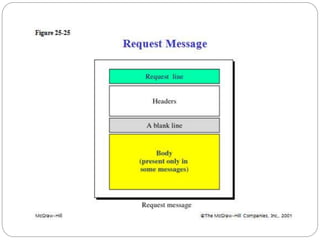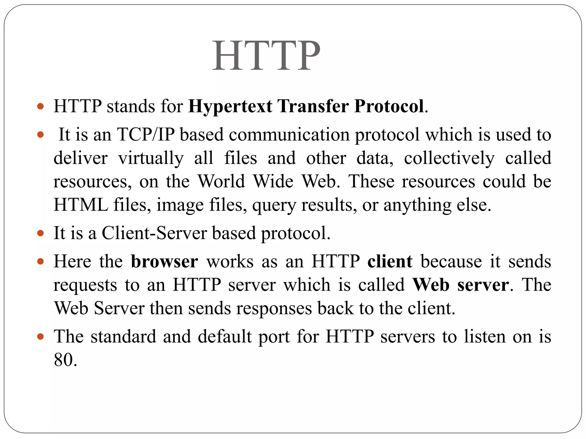 HTTP is a protocol for transmitting hypermedia documents across the internet. It uses a client-server model where browsers make HTTP requests to web servers, which respond with HTTP responses. Key aspects of HTTP include using TCP/IP for communication, being stateless, supporting a variety of data types, and incorporating features of both FTP and SMTP protocols.
