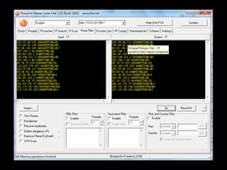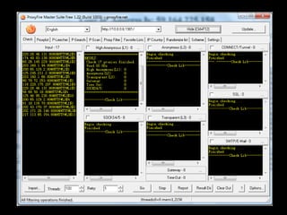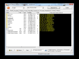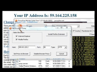 This document discusses HTTP proxy servers. It defines a proxy server as a server that acts as an intermediary for requests from clients and acts as a client to the actual servers. An HTTP proxy server specifically handles HTTP requests. It can speed up browsing by caching frequently requested pages. It also anonymizes user requests and reduces load on the internet connection. The document then discusses the software Proxyfire as an example of a "distorting" HTTP proxy server and provides screenshots of its interface. It concludes by listing the hardware and software specifications of the system used.