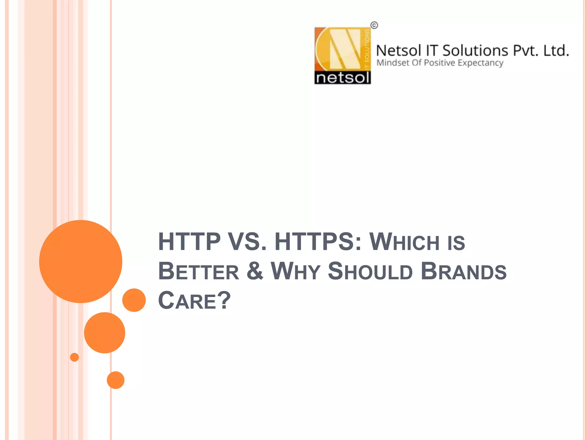 HTTP is the standard protocol for transmitting web pages but it is less secure than HTTPS as it does not encrypt data. HTTPS encrypts data transmitted between systems using SSL to prevent hacking. While HTTP uses port 80 by default, HTTPS uses port 443, making it more secure. Brands should switch to HTTPS to protect customer data, gain user trust, improve search engine rankings, and prepare for browsers increasingly requiring HTTPS in the future.