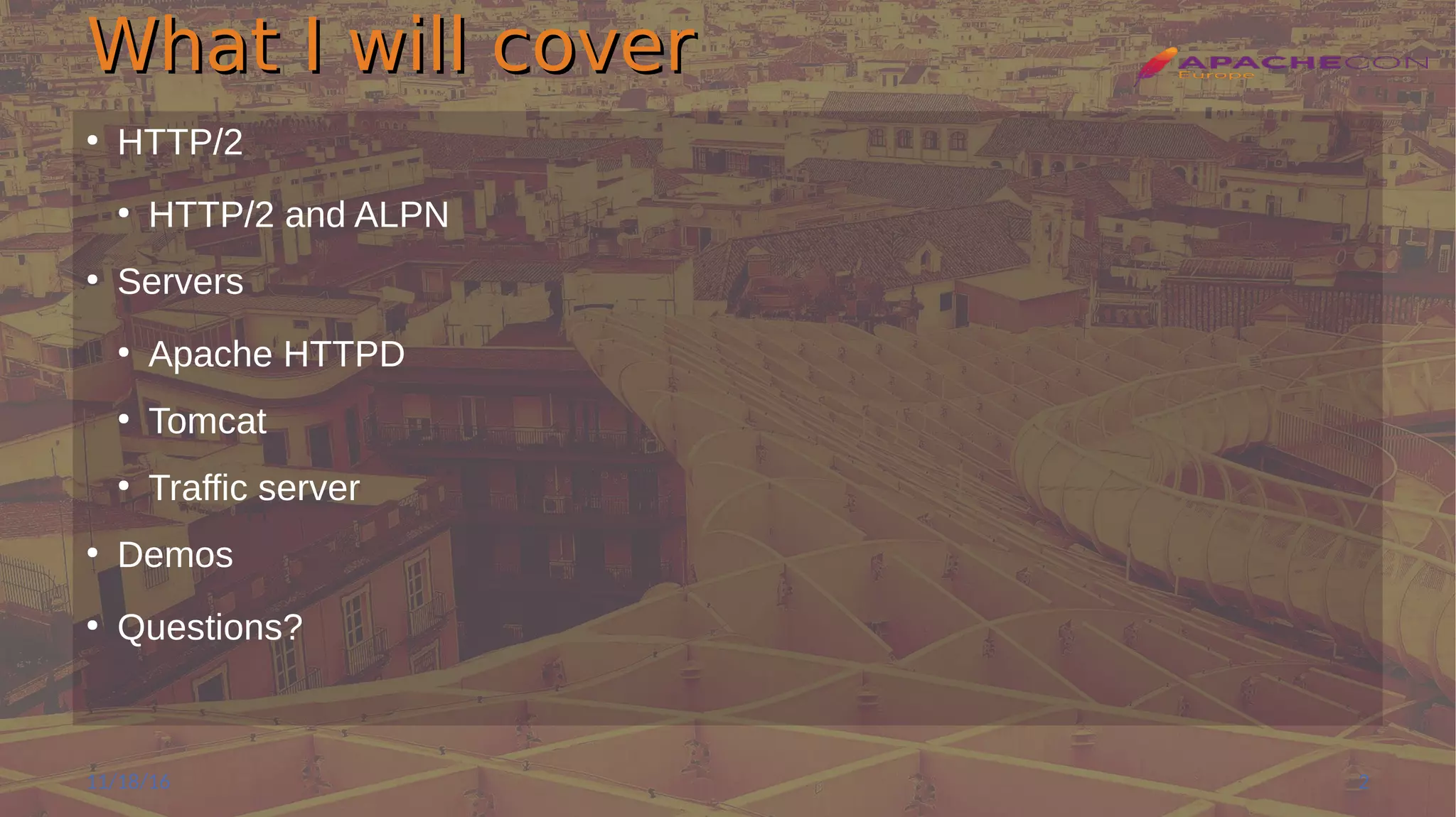 Jean-Frederic Clere presented on the state of HTTP/2 and SSL/TLS in Apache Tomcat, Apache Traffic Server, and Apache HTTP Server. He discussed how HTTP/2 provides benefits like header compression, request multiplexing and priority over HTTP/1.1. All three servers now support HTTP/2 through TLS, with Tomcat and HTTPD having full support and Traffic Server missing some features. Performance tests showed HTTP/2 providing higher throughput and lower CPU usage than HTTP/1.1. The presentation concluded that applications are ready to use HTTP/2 without modifications to see performance gains.
