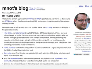 IETF の報告の場 ○ 仕様の議論の場 ○ ガチで実装する場 ○ これからを考える場 ● ゴール ○ HTTP2 の RFC 化 ○ そこへの貢献 ● 成果 https://www.mnot.net/blog/2015/02/18/http2