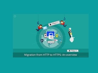 This document discusses the migration from HTTP to HTTPS, explaining that HTTPS provides encryption, data integrity and authentication using the Transport Layer Security protocol to securely exchange information over the web. It notes that securing a website with HTTPS protects against threats like downgrade attacks, SSL/TLS vulnerabilities, hacks, DDoS attacks, brute force attacks and software vulnerabilities. The document also outlines several SEO advantages of using HTTPS, such as ranking boosts, reduced crawling errors and the ability to attract links and optimize site speed and content.